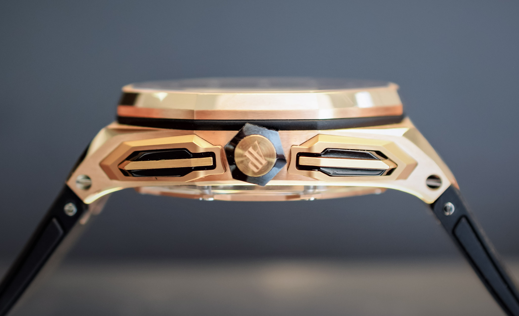 The main design features of the ROO are still present: the barrel-shaped case with integrated lugs, the octagonal bezel, the 8 hexagonal screws, the way the bezel is attached to the case and separated by a massive black rubber gasket, the mix of materials, the contrasts between the colours and the finishing. There is no confusion possible, this new watch is clearly a member of the family. The iconic design has been used as a base, yet Audemars Piguet has decided to make this watch even bolder than before.
