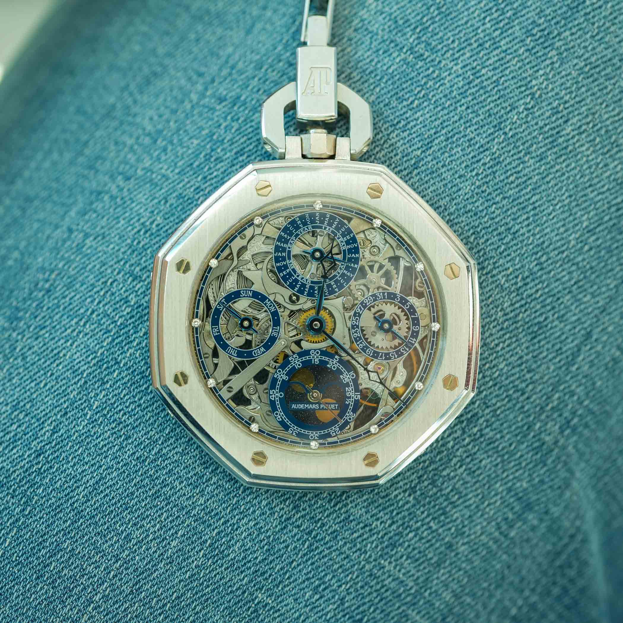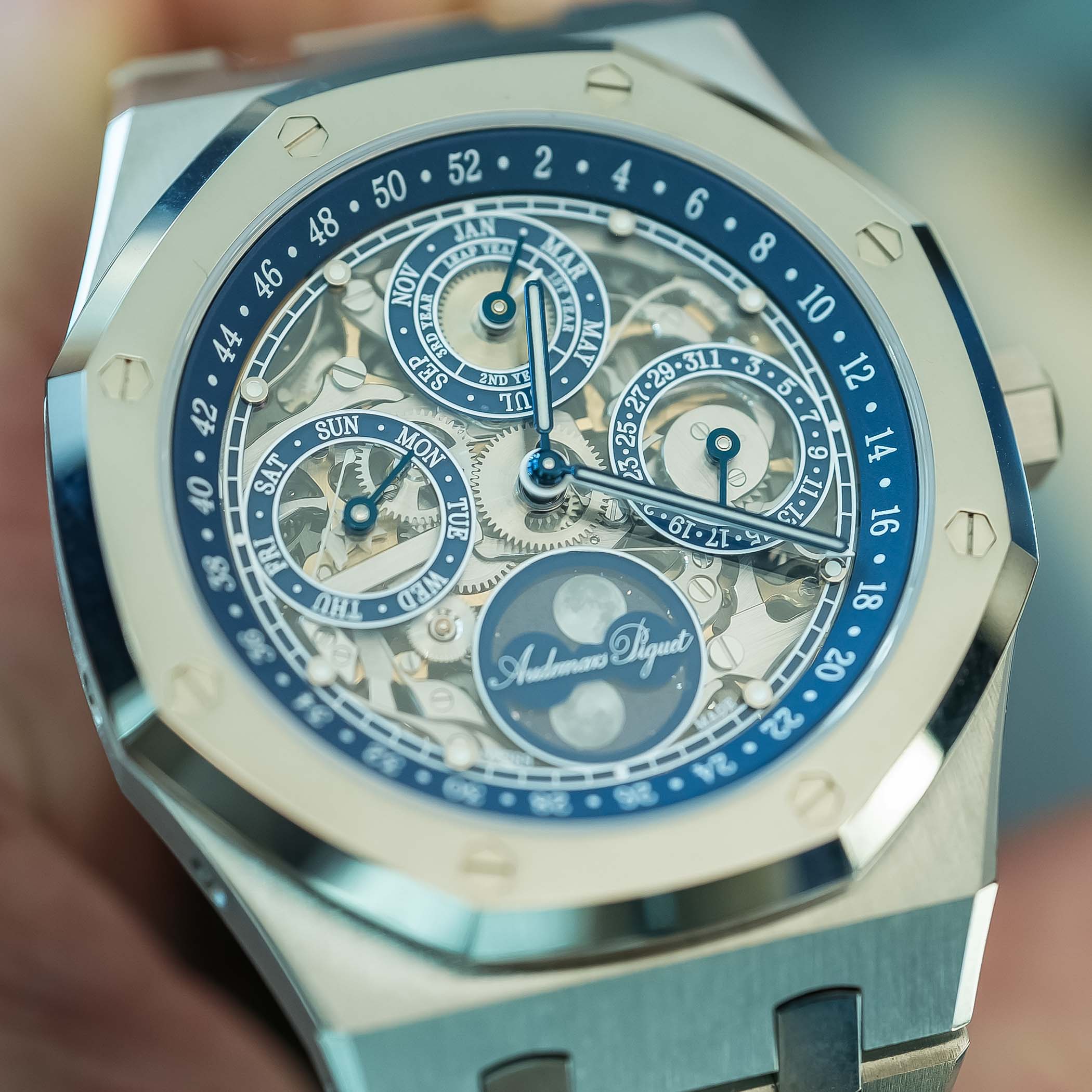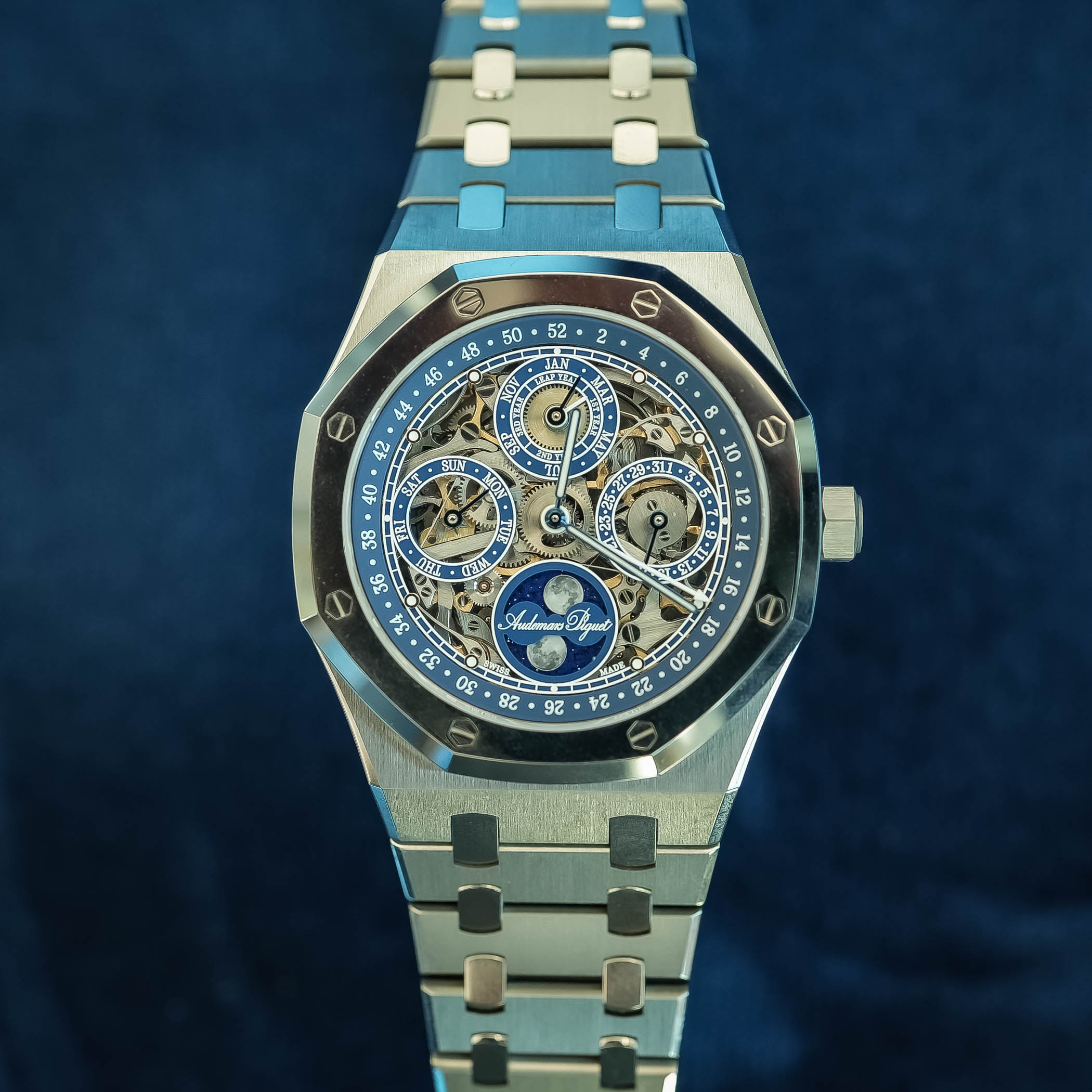 Several design cues pay tribute to AP’s historic openworked perpetual calendar pocket watch (Ref. 25729), displayed at the brand’s museum. These include the rich blue tones of the sub-dials and inner bezel, silver-grey round indices, and the refined typeface of the markings. The stylized Audemars Piguet signature is a standout detail positioned across the astronomic moon phase sub-dial.