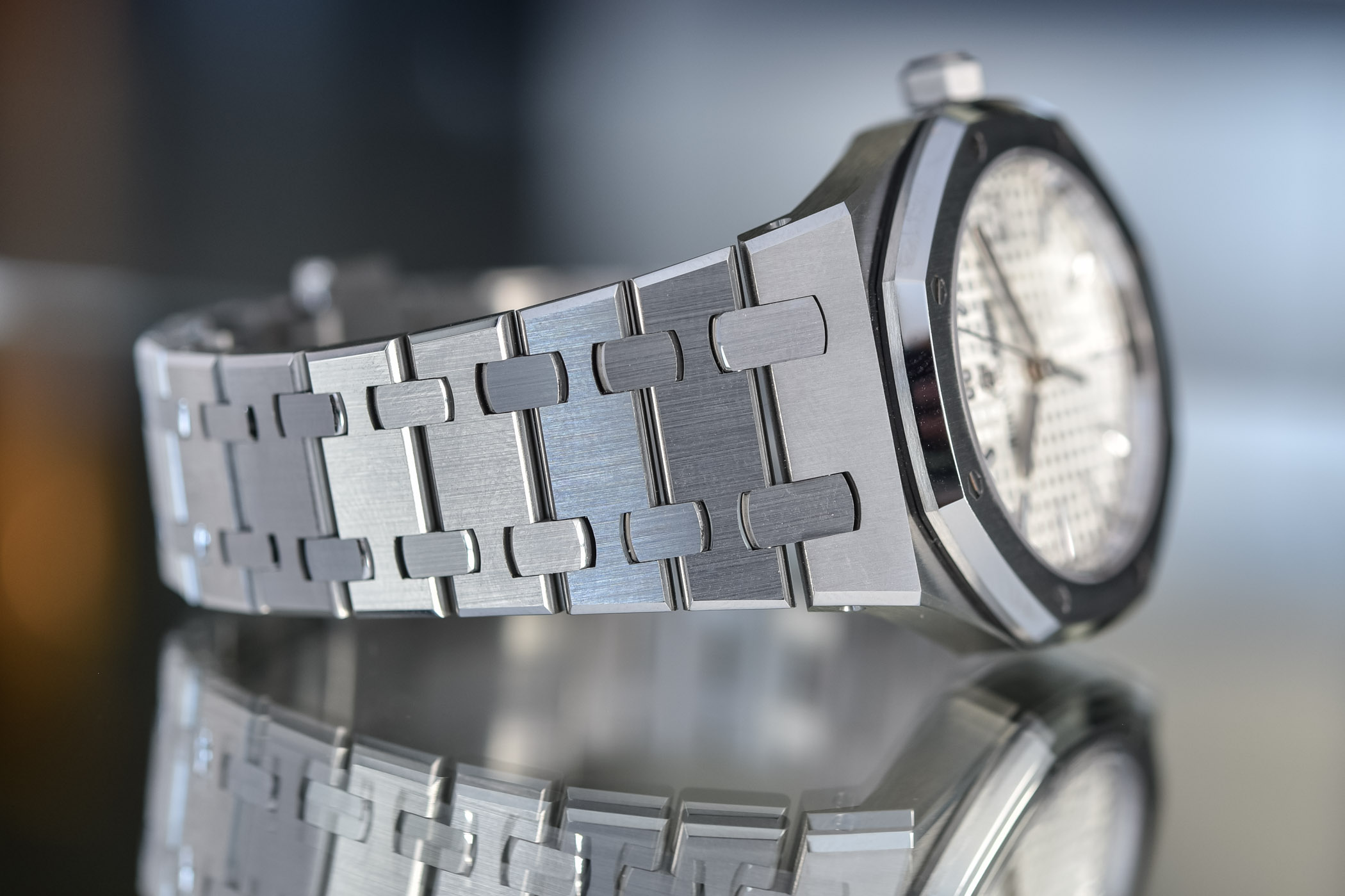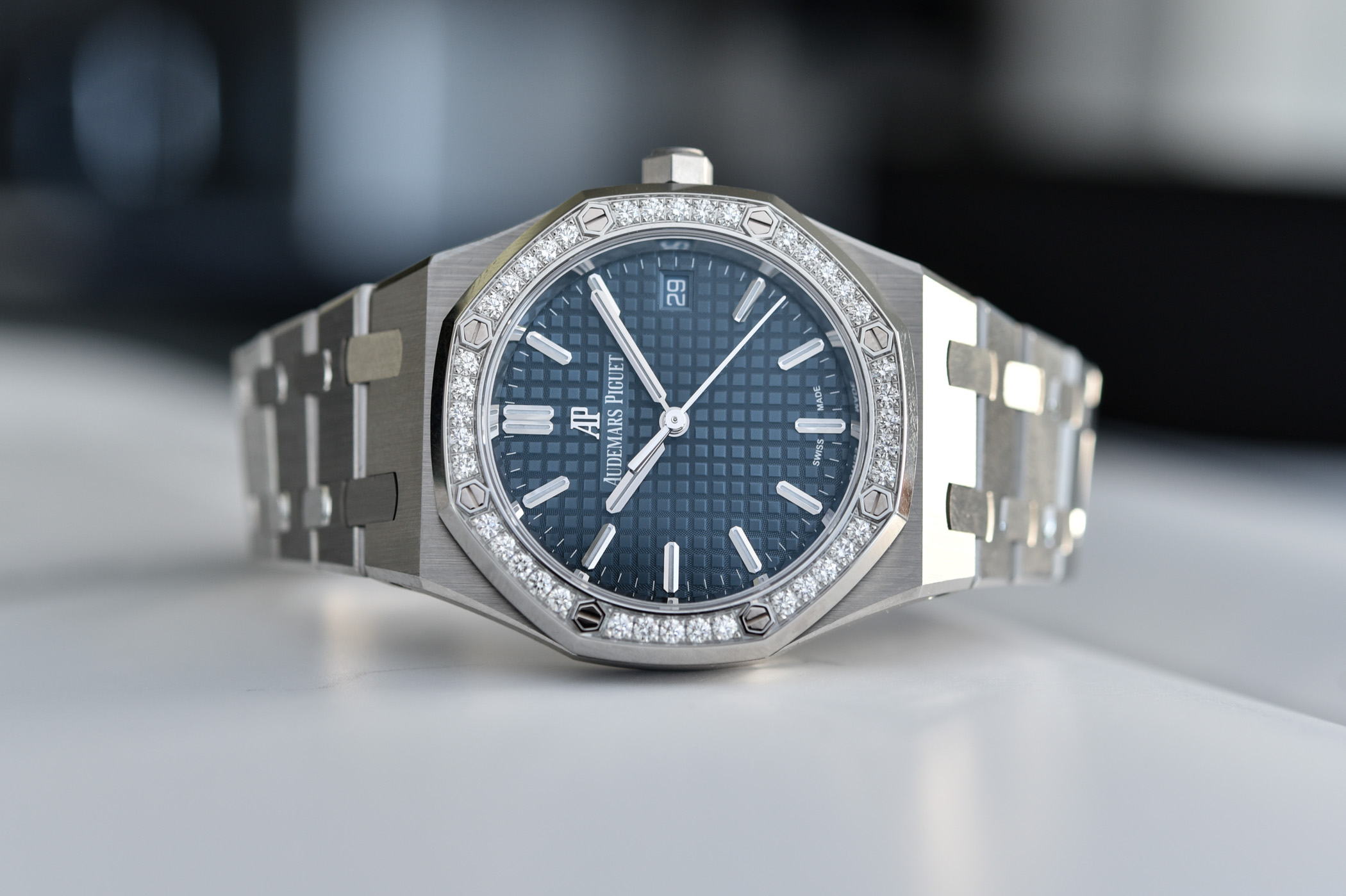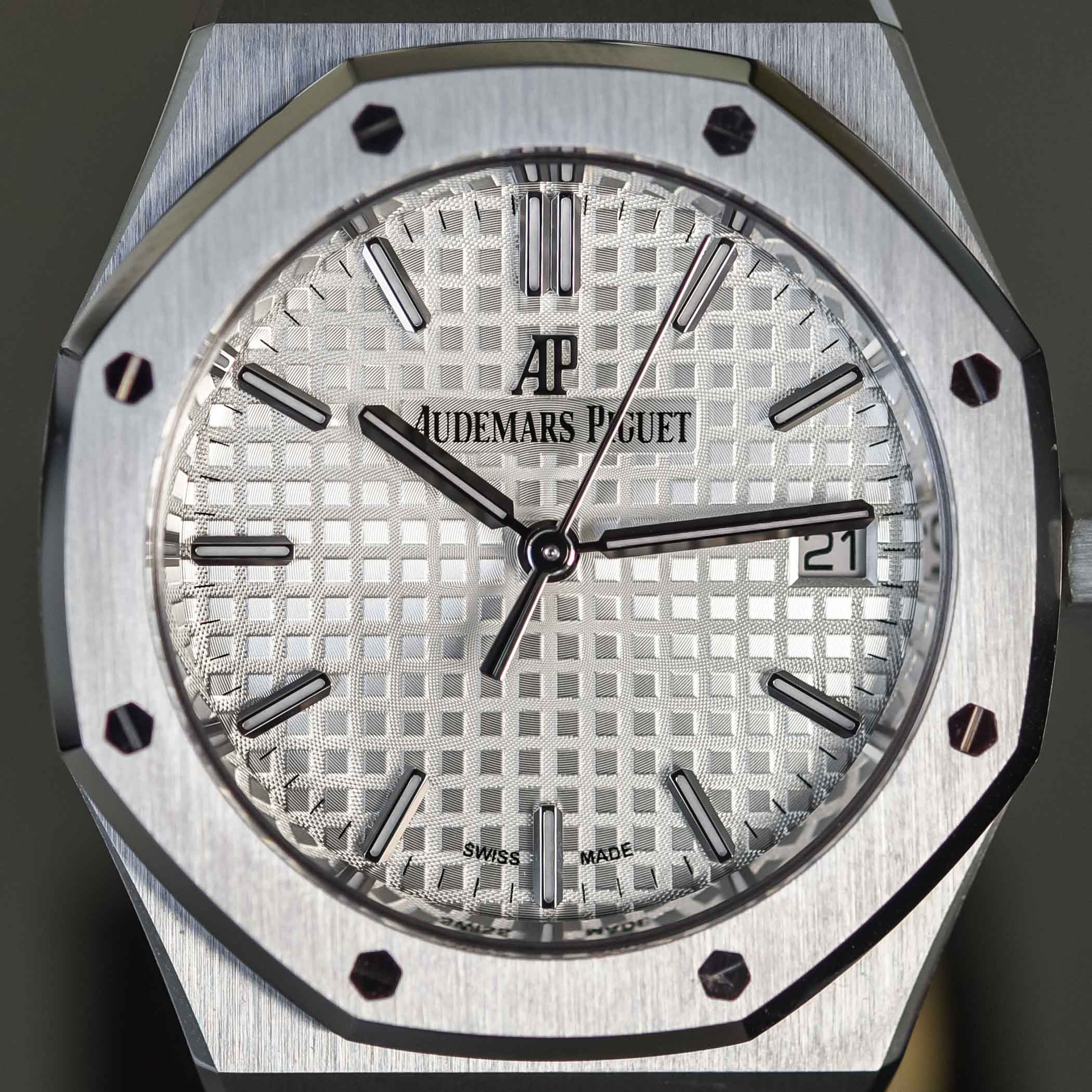 The signature guilloché ‘Grande Tapisserie’ pattern on the dial provides an interesting textured background that is a key identity trait of the Royal Oak family. Unlike the silver-toned 41mm RO Selfwinding, we introduced a few weeks ago with its smooth-textured minute track, the minute tracks of the new 34mm are printed directly on the guilloché pattern.
