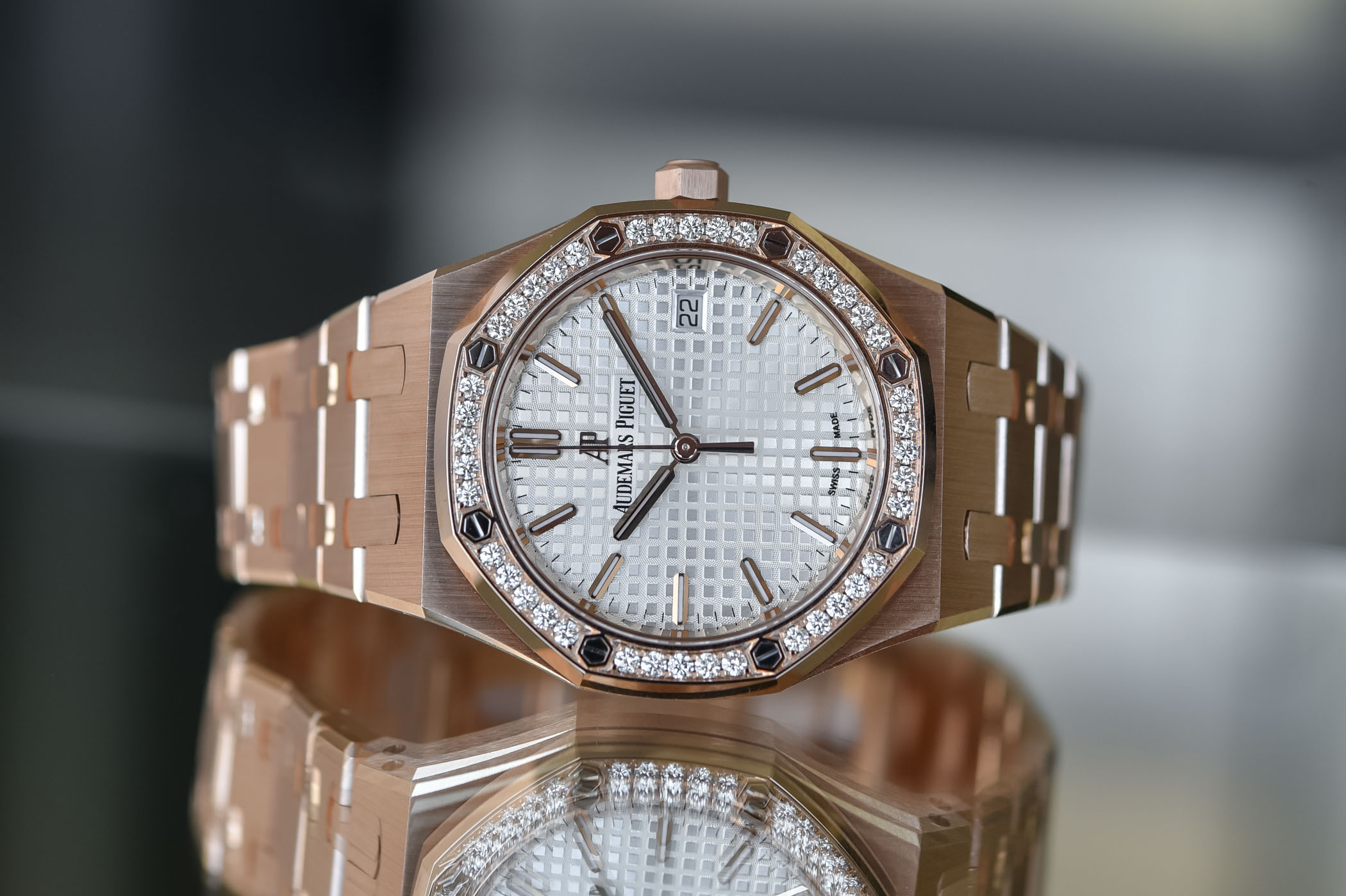 The Audemars Piguet Royal Oak Selfwinding 34mm model in steel retails for CHF 18,400; the steel model with a blue dial and diamonds for CHF 23,200; the two-tone pink gold and steel for CHF 21,600; and the solid pink gold with diamonds for CHF 44,700. They are now available at boutiques and retailers.