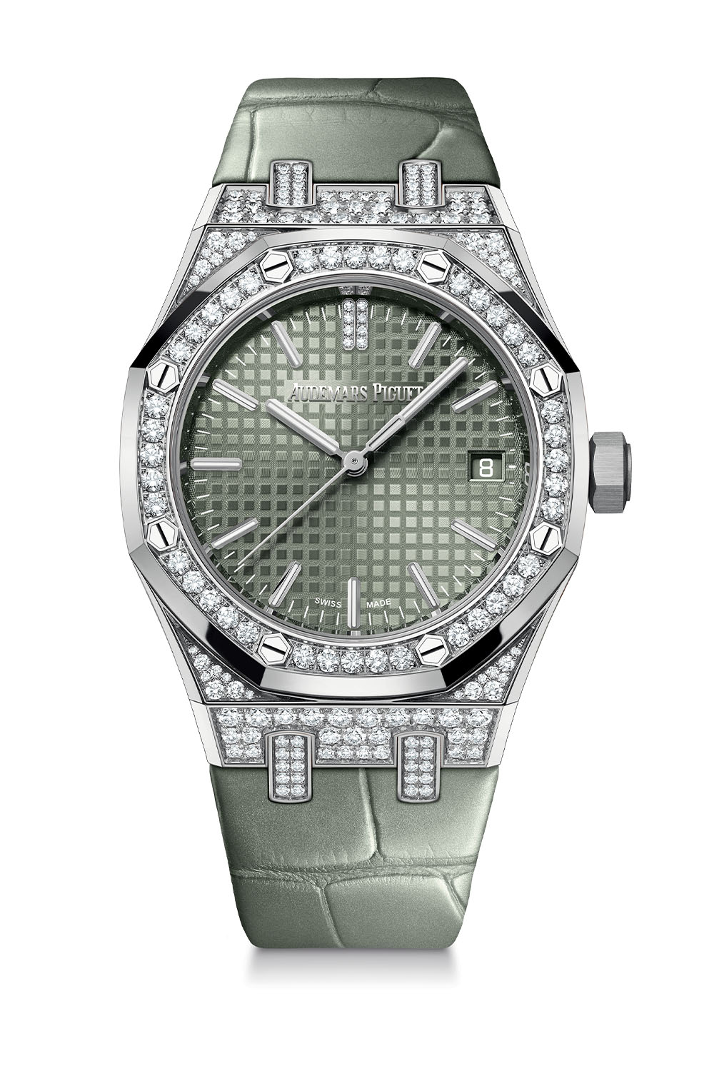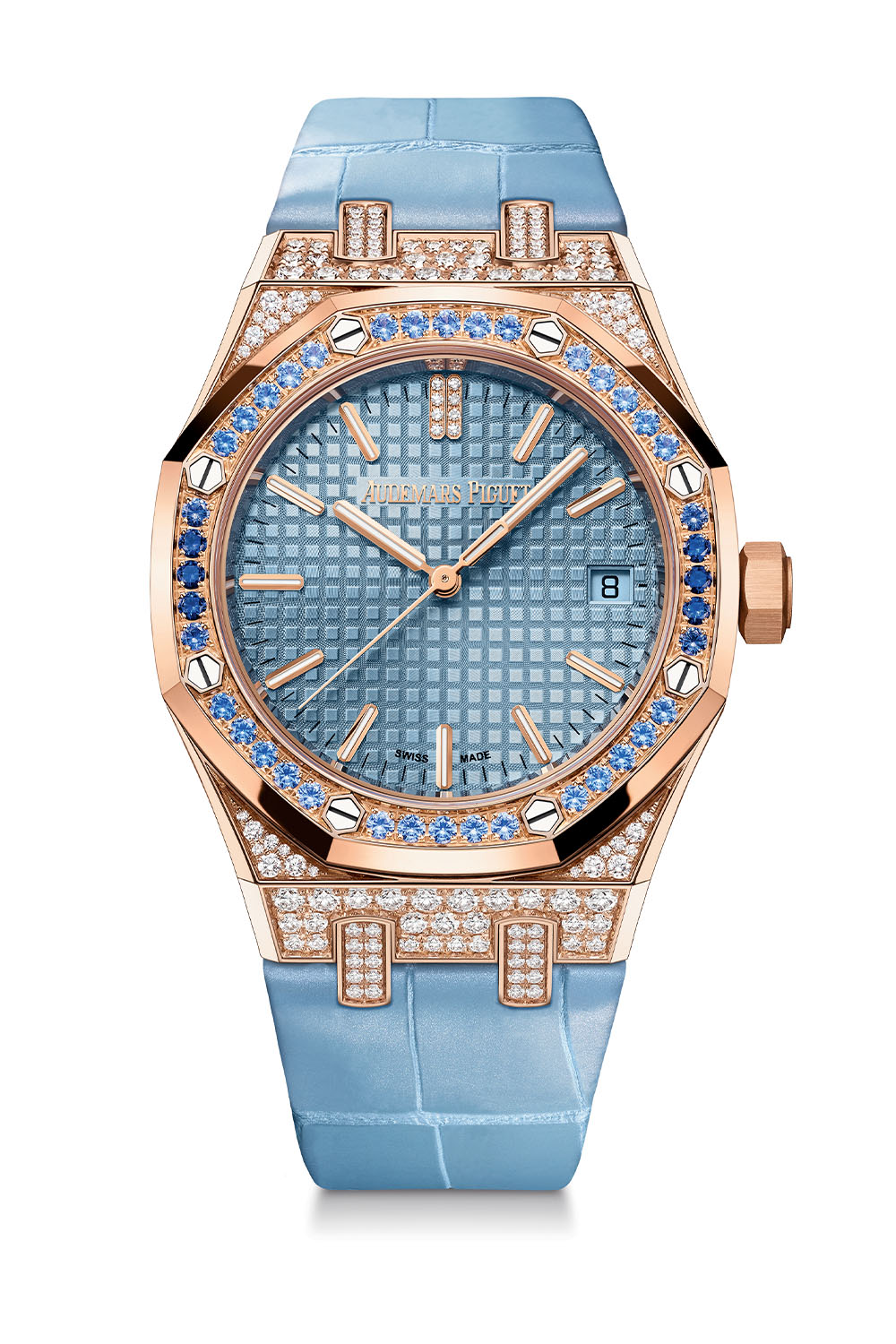 Available in 18k pink gold or white gold, the new 37mm models highlight the dynamic architecture of the case with a flurry of brilliant-cut diamonds. The pink gold RO Selfwinding model is paved with 164 brilliant-cut diamonds on the case, bracelet studs and AP folding clasp. Given the case’s geometry, the diamonds must be cut in different sizes to adapt to their contours. The eight-sided bezel glows with 40 brilliant-cut gradient blue sapphires, designed to mirror the colour of the light blue Grand Tapisserie dial. Matching the light blue colour of the stones and dial, the watch comes with a pearly pastel blue alligator strap.