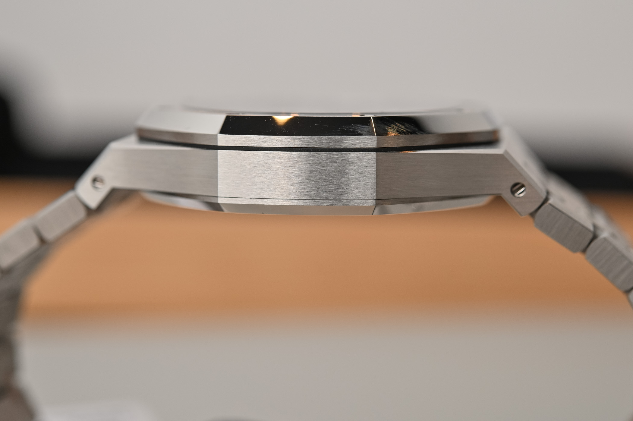 The case keeps its 41mm diameter and the same overall design. This means that we have the signature sharp case, an integrated bracelet and the octagonal bezel on top. The shapes, the finishing of all the surfaces and the proportions are all approximately the same as before. However, here again, the new movement has had consequences on the case.