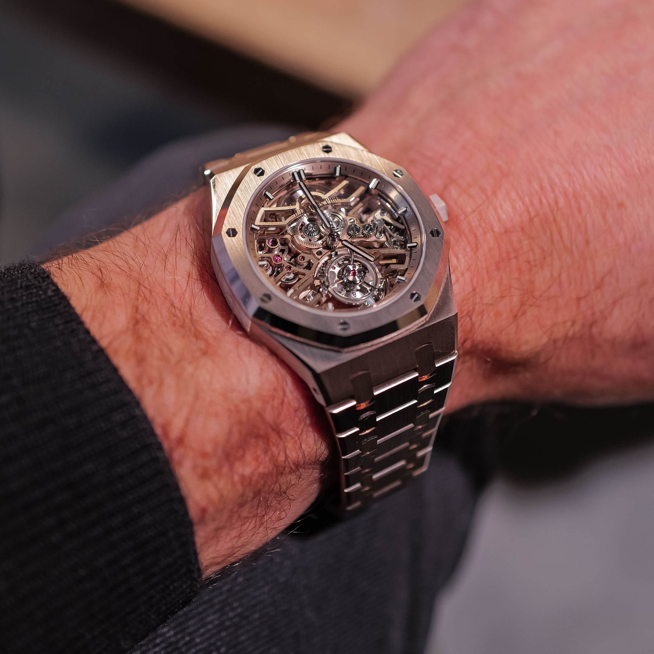 While the Royal Oak was initially born in stainless steel – which, in our opinion, remains the material of choice for the classic Jumbo – the emblematic Audemars Piguet collection rather quickly embraced gold. Since then, precious metals have become integral to the series, always leaving a memorable impression. In its latest venture, the brand introduces a novel 18k gold alloy labelled “sand gold” – a mix of solid gold with copper and palladium – unveiling a new variant of the Royal Oak Selfwinding Flying Tourbillon Openworked chosen to showcase the unique aesthetic qualities of this material.