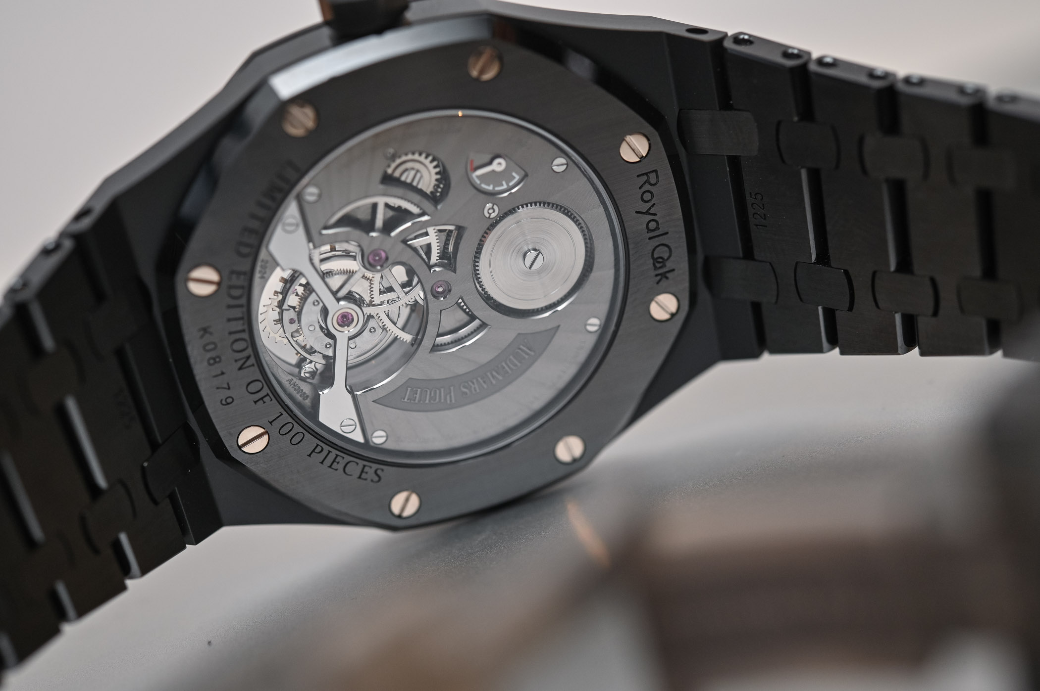 The rare and superb full black ceramic Royal Oak receives the extra-thin Tourbillon movement.