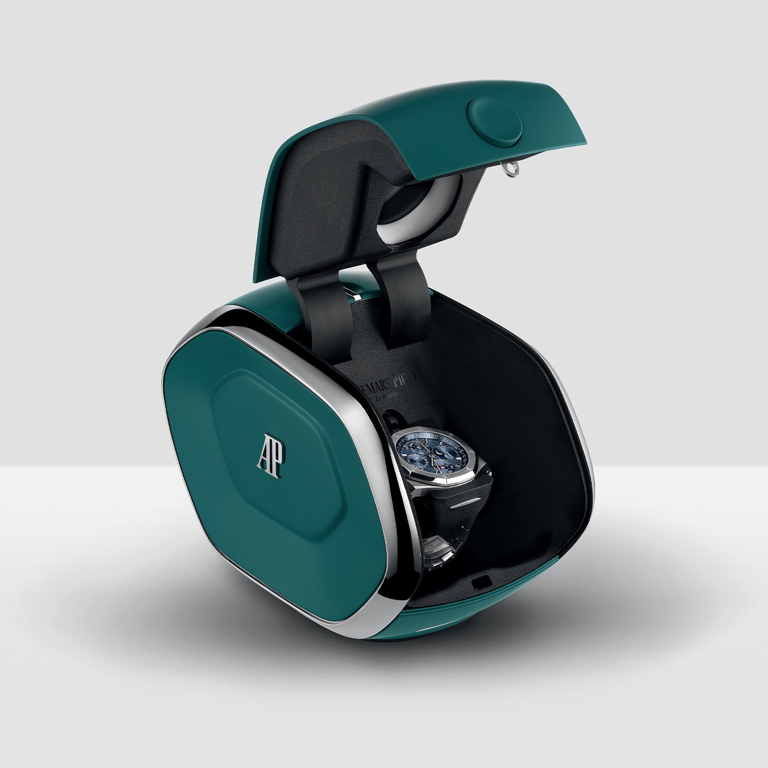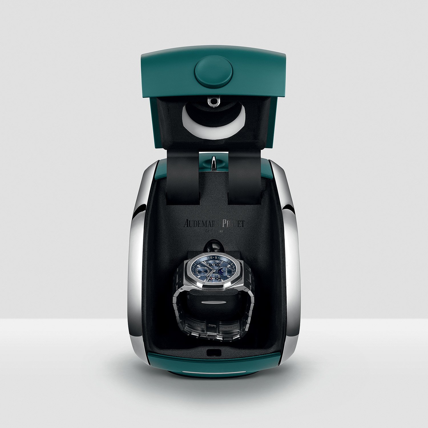 While winding boxes are often used for perpetual calendars, Audemars Piguet now goes one step further with an automated solution combining mechanical engineering with robotics, computing, and AI, developed with the Dubai Future Foundation. Placing your AP perpetual calendar inside the box with the lid closed, a camera identifies which indications need to be adjusted, and the system performs all corrections within 5 minutes, replicating the action of a human hand on the crown.