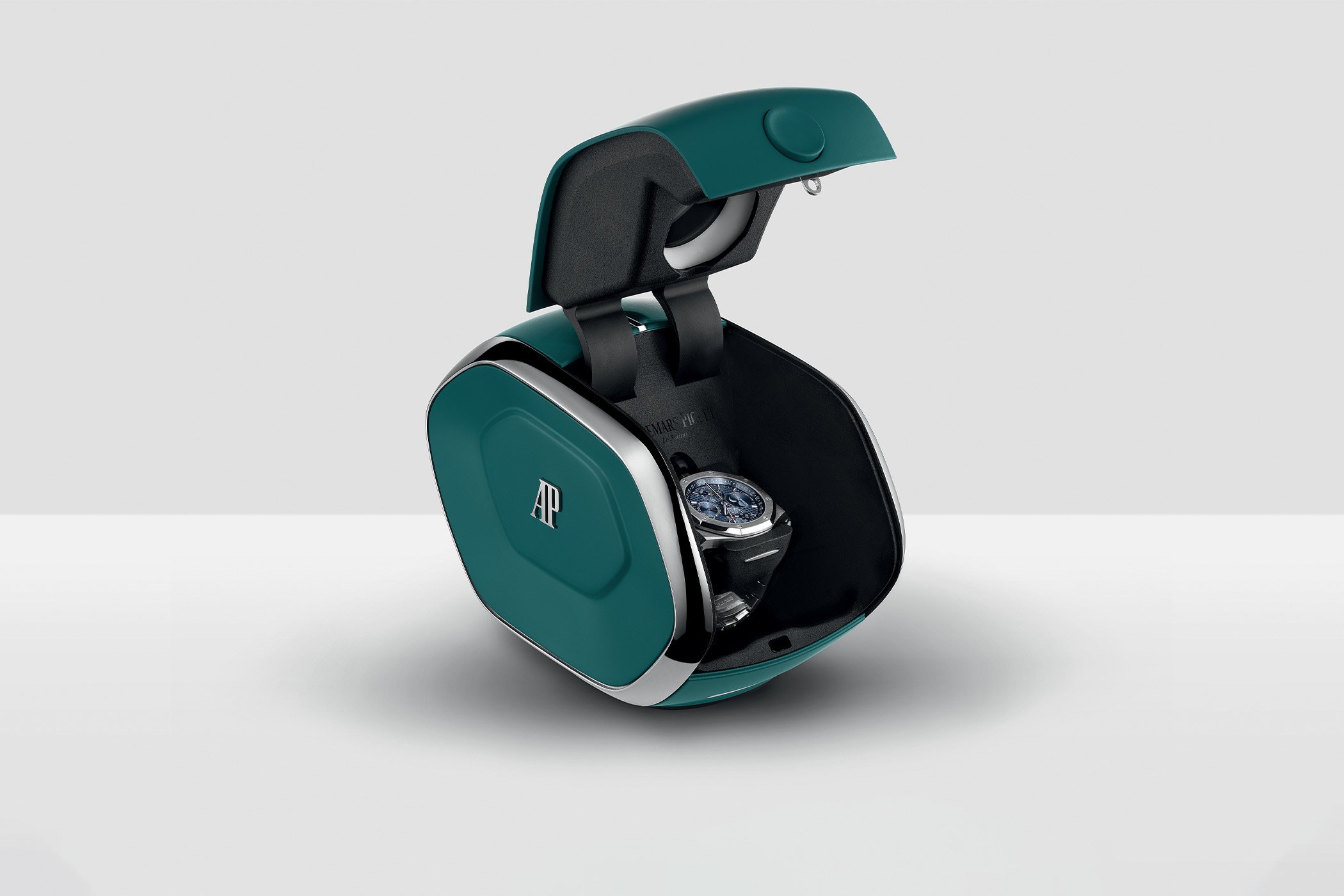 While winding boxes are often used for perpetual calendars, Audemars Piguet now goes one step further with an automated solution combining mechanical engineering with robotics, computing, and AI, developed with the Dubai Future Foundation. Placing your AP perpetual calendar inside the box with the lid closed, a camera identifies which indications need to be adjusted, and the system performs all corrections within 5 minutes, replicating the action of a human hand on the crown.