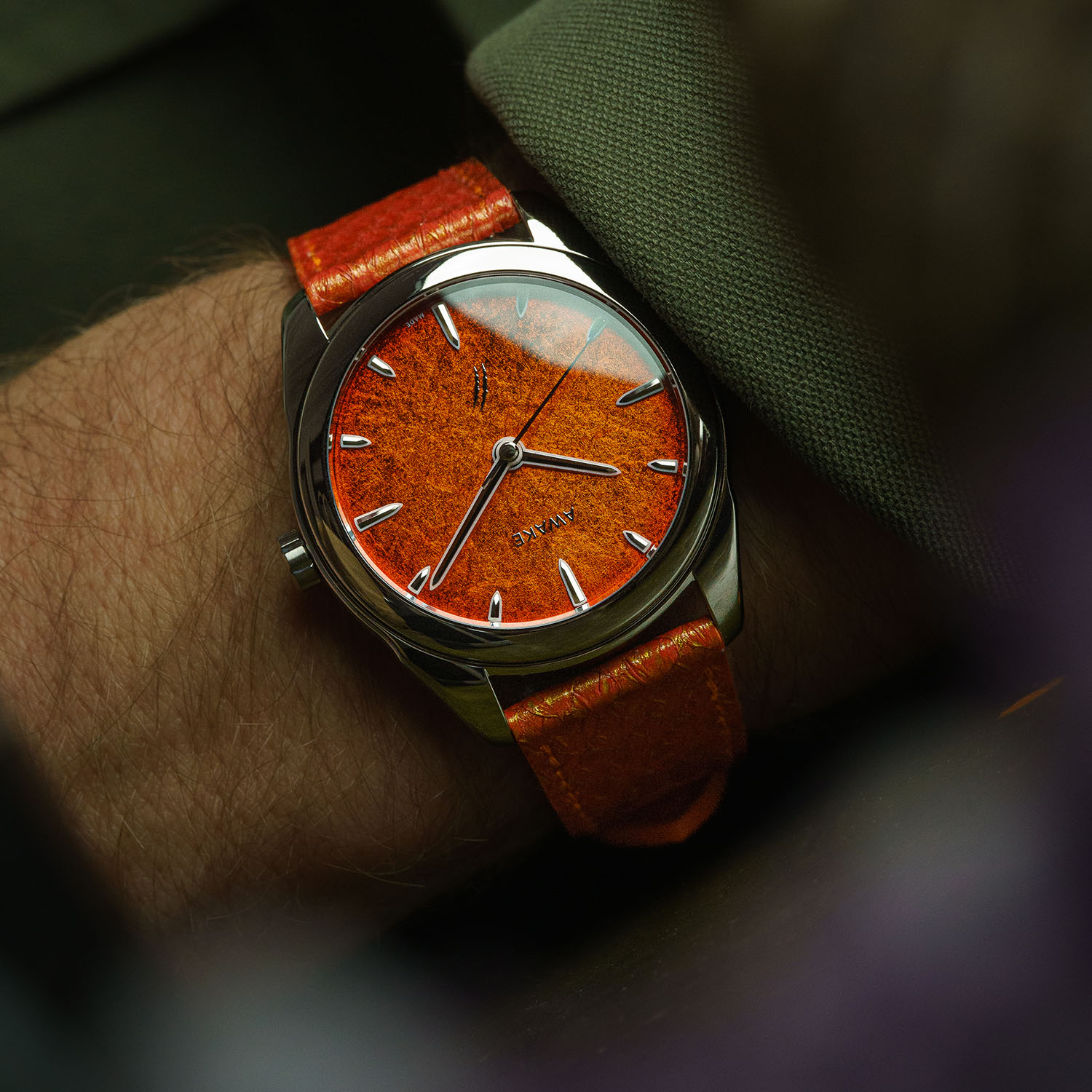 Telling time on these is a joy – lacquered dials with applied indices and hands coated in Super-LumiNova keep things clear day or night. Inside beats the La Joux-Perret G101 automatic movement, offering a good 68-hour power reserve. Each version is paired with a leather strap made from scaled salmon skin, in deep green for the Raptors, bright orange for the T-Rex, with an iridescent finish, and fastened with a stainless steel pin buckle.