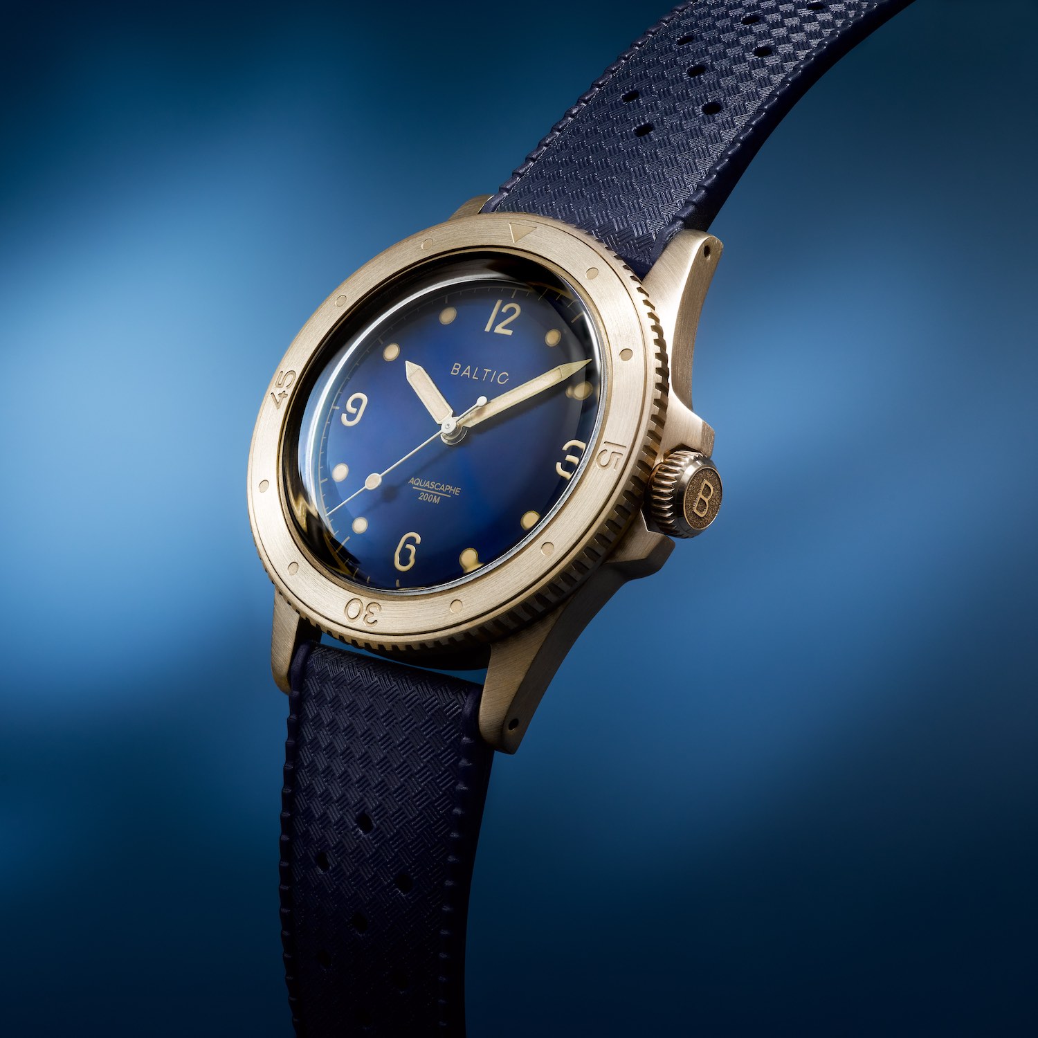 For the occasion of this new Baltic Aquascaphe Bronze, the dial has also evolved with small details that give this model its own personality. The dial has the brand’s signature blue colour with gilt markings and a sunray brushed decoration. The evolution concerns the markers, as the triangular indexes have been replaced by Arabic numerals. In the same vein, we see “maxi” hands for the hours and minutes and a white lollipop seconds hand. The display remains without a date.