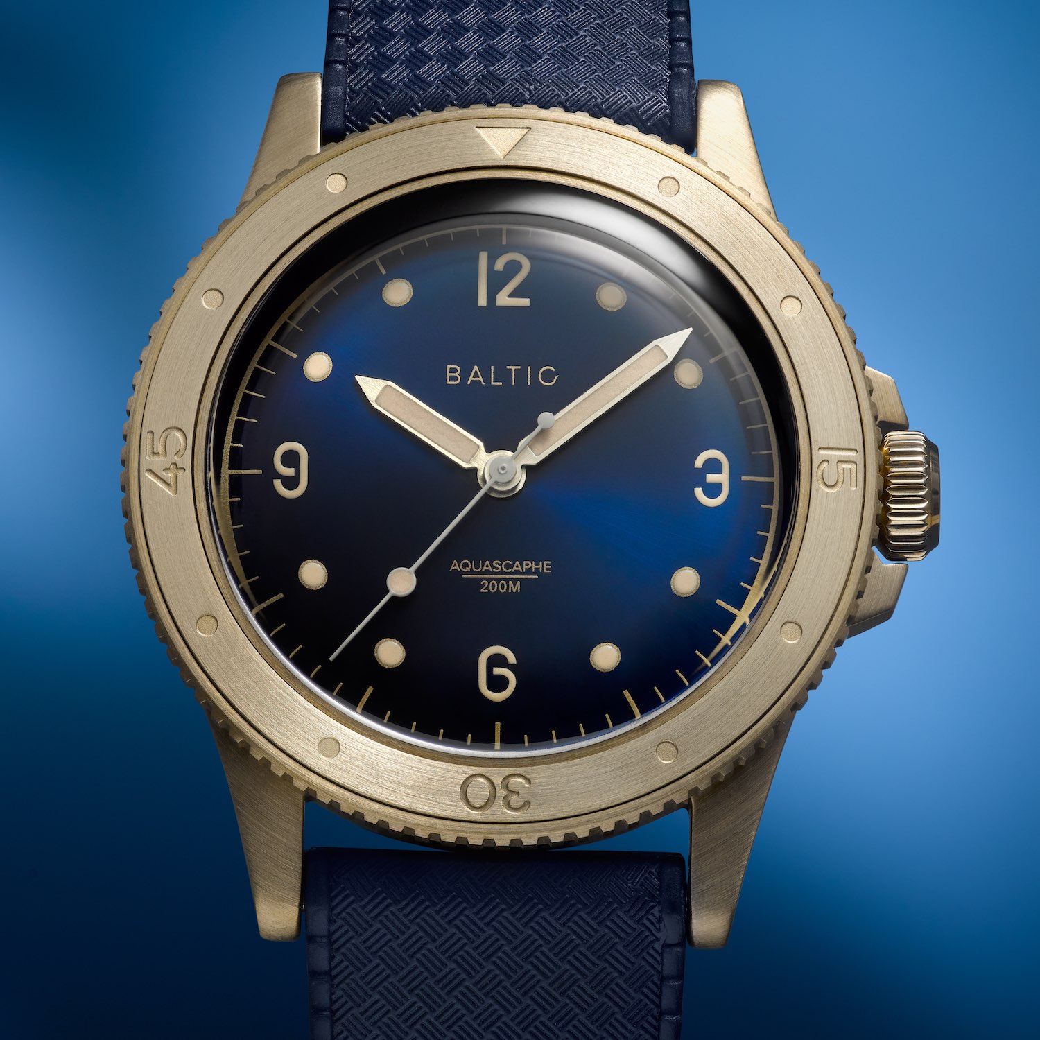 Based on this watch, the brand wanted to offer something a bit more urban, a bit dressier, with warmer tones. While gold PVD wasn’t an option for Etienne, he has decided to go for bronze – a material that makes sense in an aquatic context and is trendier than ever. The case of the Baltic Aquascaphe Bronze remains almost identical to the steel models, with a 38mm (39mm for the bezel), with its brushed surfaces, lugs holes and very instrumental shape. The novelty comes from the material, a stable bronze alloy – CuAL8 – composed of aluminium and copper, as opposed to standard bronze (copper and tin), which has a tendency to develop a stronger and faster (toxic-looking) green patina. The case of the Baltic will slowly but ever so slightly change over time to become less gold coloured.