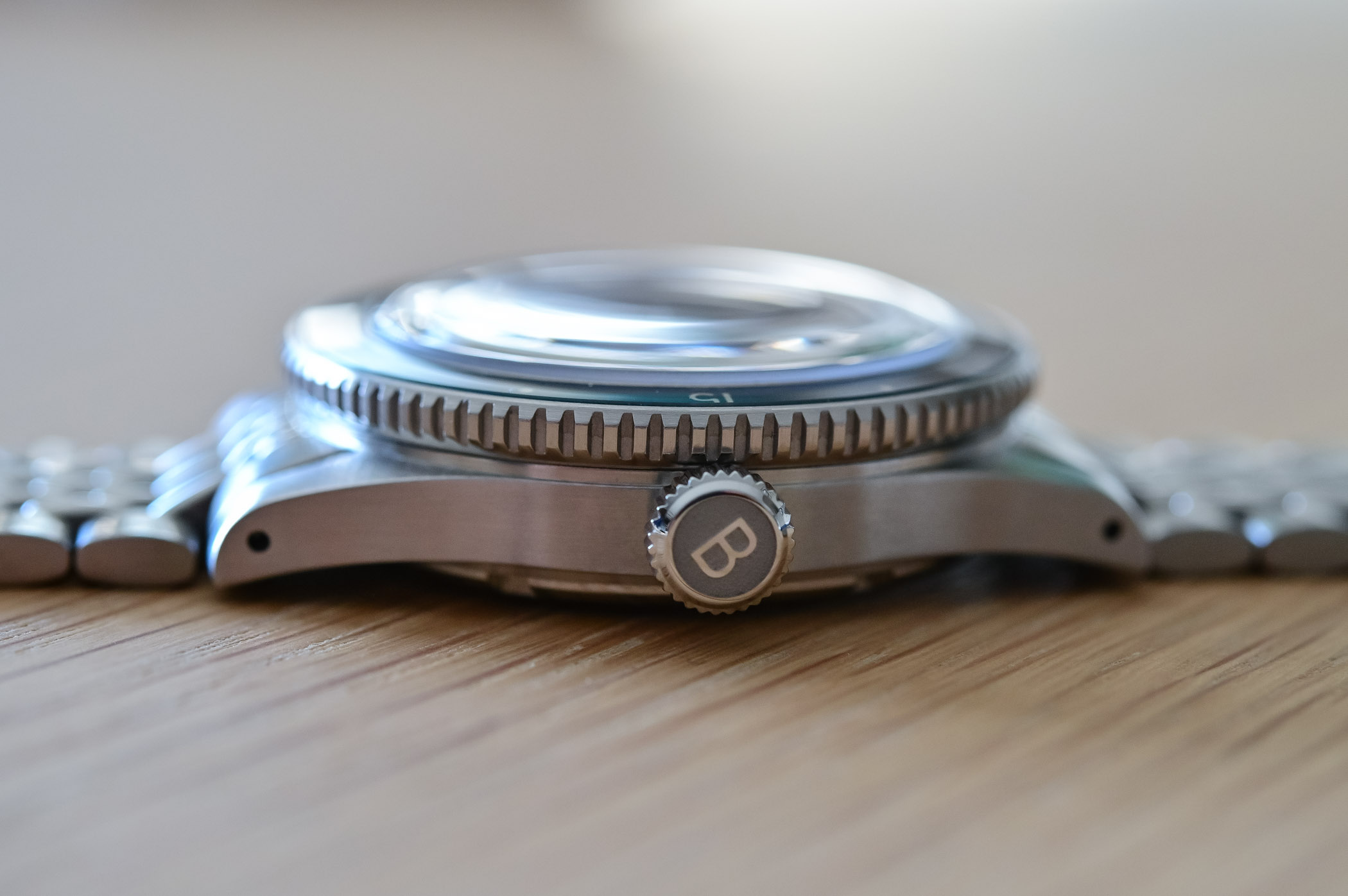 On top of the case sits a large, easy-to-rotate bezel. It features 120 clicks and feels solidly attached to the case. The coin-edge profile is a nice touch, again historically relevant. The bezel insert is well-executed made of polished sapphire with numerals printed on the internal surface. Not only does it provide a great sense of depth but also adds value to the watch. This is combined with a domed sapphire crystal, which is purposefully reflective… Nice to look at, hard to photograph.
