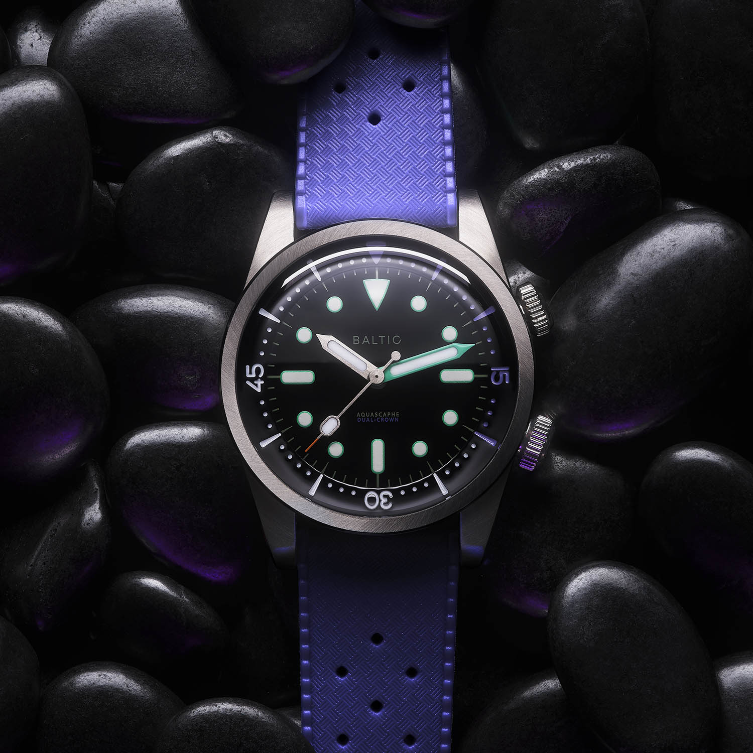 The dial of the Baltic Aquascaphe Dual-Crown 5th Anniversary also feels classic at first, with its black glossy base and painted markers in white luminescent paint. But as said, this limited edition is all about colours – 3 of them to be precise. First, turquoise is used to outline the hour markers and to accentuate the minute hand. Then, purple has been applied to the first 20-minute segment of the rotating bezel. Last, the seconds hand sees its tip coloured in bright orange. The two main colours are also used on the logos at 6 o’clock. The layout remains otherwise classic with a time-only display. All elements are coated in Super-LumiNova, with green or blue emissions depending on the indications.