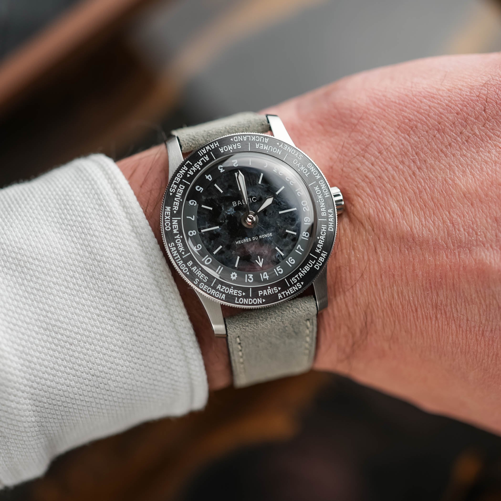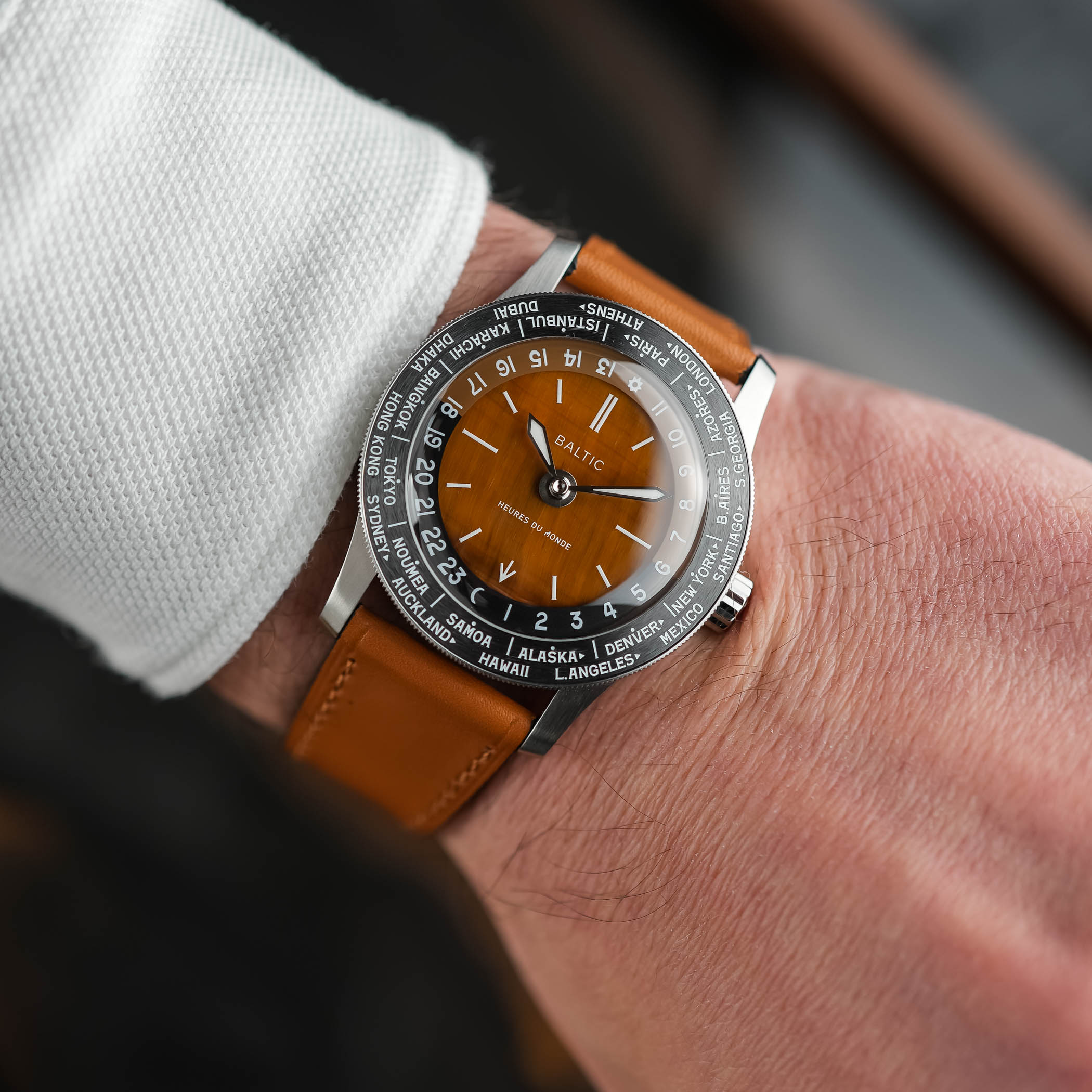 Following the same colour as the dial and bezel, the scaled disc can be adjusted independently via the crown, letting you set a second time zone without interrupting the main display. From there, the city ring lets you check the time in other locations. The case sticks to what Baltic usually does, with a compact size that wears easily on the wrist. It comes in stainless steel, measuring 37mm across with a 45mm lug-to-lug, 20mm lug width, and a thickness of 11.3mm (or 9.3mm without the crystal). All of this makes it a compact watch, a size that works well when travelling.