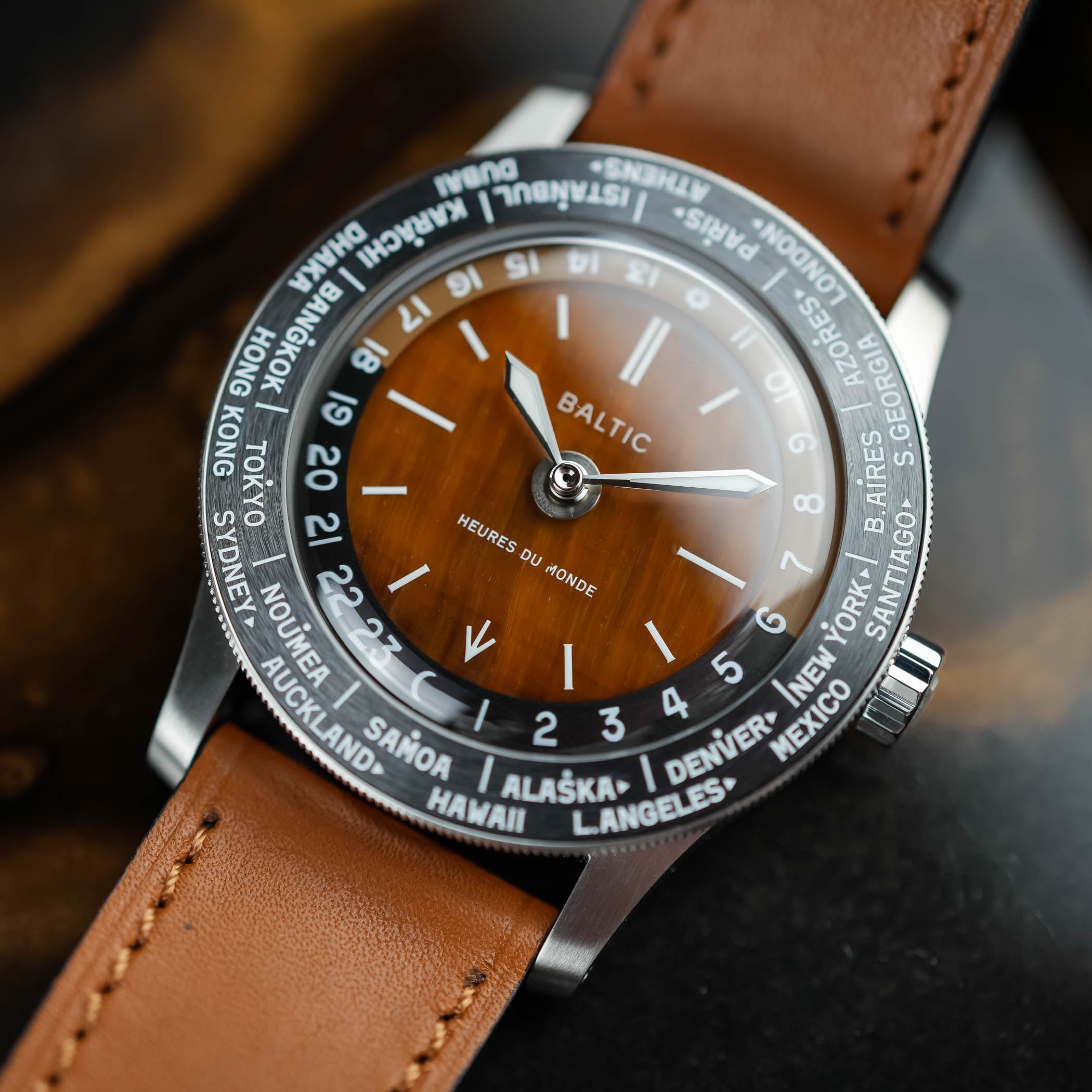 The dial is where Baltic has a bit more fun with the new Heures du Monde collection. There are multiple options on offer, including stone dials that bring a completely different feel to it. You can choose between labradorite, tiger eye, and sodalite, each offering its own look. Labradorite is the darker one, with hints of blue and grey that show up depending on the light. Tiger eye dons a warmer look, with brown tones, while sodalite leans more into deep blue. Together, they add texture and variation, giving the watch a more relaxed feel, less like a typical tool watch. Each dial is cut from natural stone, so no two will look exactly the same.