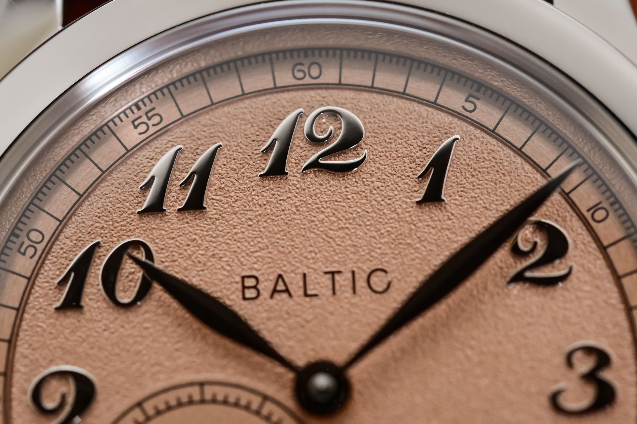 First, note that although we only had the salmon version of the Baltic MR01 for this hands-on article, there are three different dials to choose from, including a silver and a blue one. But, as you know, we have a soft spot for white metal cases and salmon dials here at MONOCHROME. The dial features emblematic elements of highly desirable vintage watches, and if the trick is kind of easy, it certainly works. It starts with a central part with a strong grained surface and a display that is not the most usual with the small seconds located at 7 o’clock. Surely, some will regret the symmetry of a small seconds at 6 o’clock, but it’s how the movement was constructed, and in the end, it gives personality to the MR01.