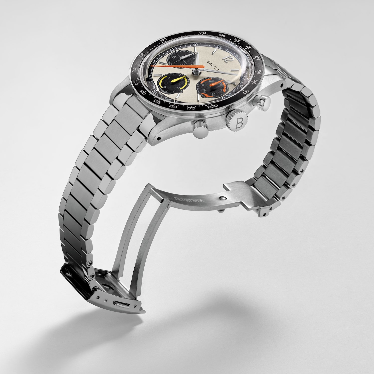Cool design, retro feel, hand-wound chrono movement and two stopwatches... Baltic ups its game and is ready to race.