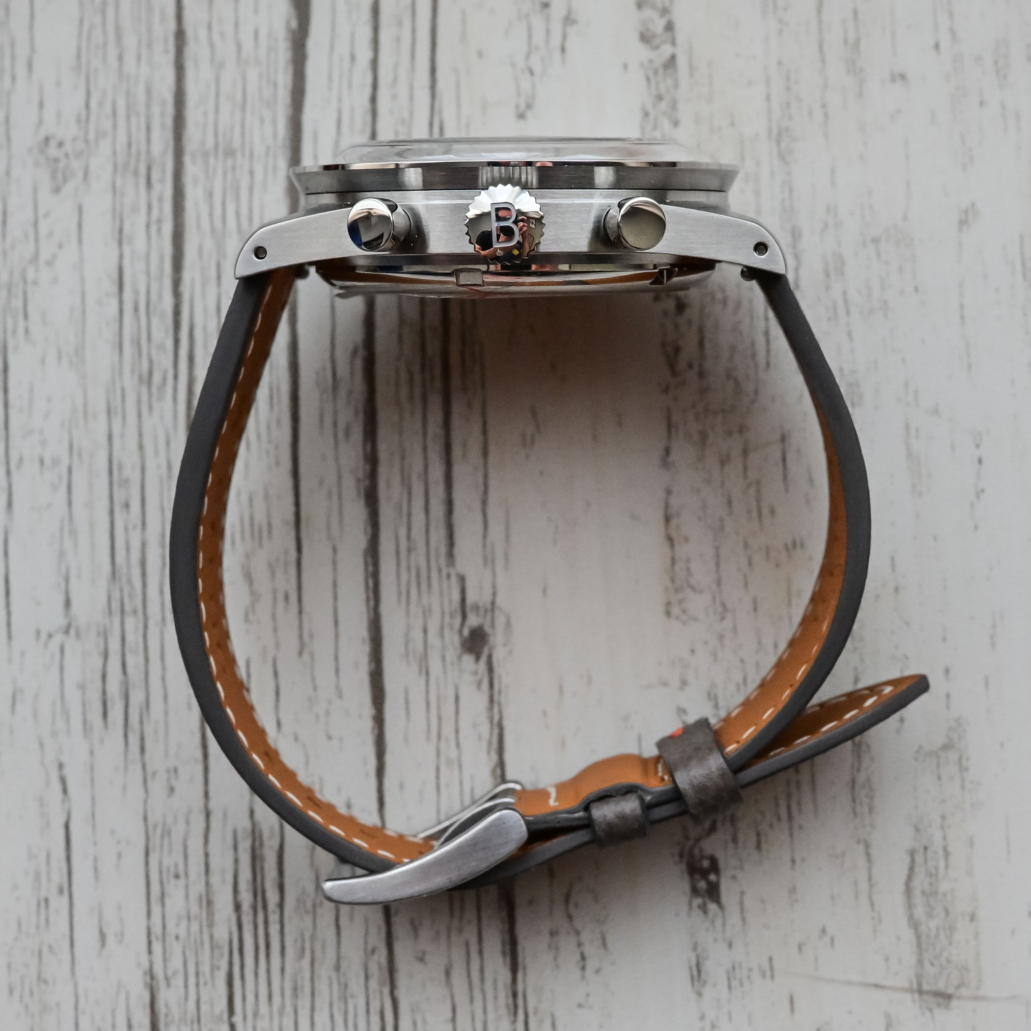 The dial of this Baltic x Peter Auto Tricompax Special Edition is surely its most striking and appealing element. First, it inaugurates a new layout for the brand – which used to have a Bicompax watch in the past, with a Chinese Seagull calibre inside. Then, it once again looks at the past but also brings its dosage of cool and bold. The base has a pleasant matte, slightly grained and light beige tone that is both discreet and warm, like a lightly faded, patinated watch. The black sub-counters contrast well with the background and, in order to make the dial more dynamic, have a pronounced concentric pattern. Hours and minutes are read with dauphine, silver-polished hands with Super-LumiNova, pointing at discreet applied markers and a black precision minutes/seconds track.