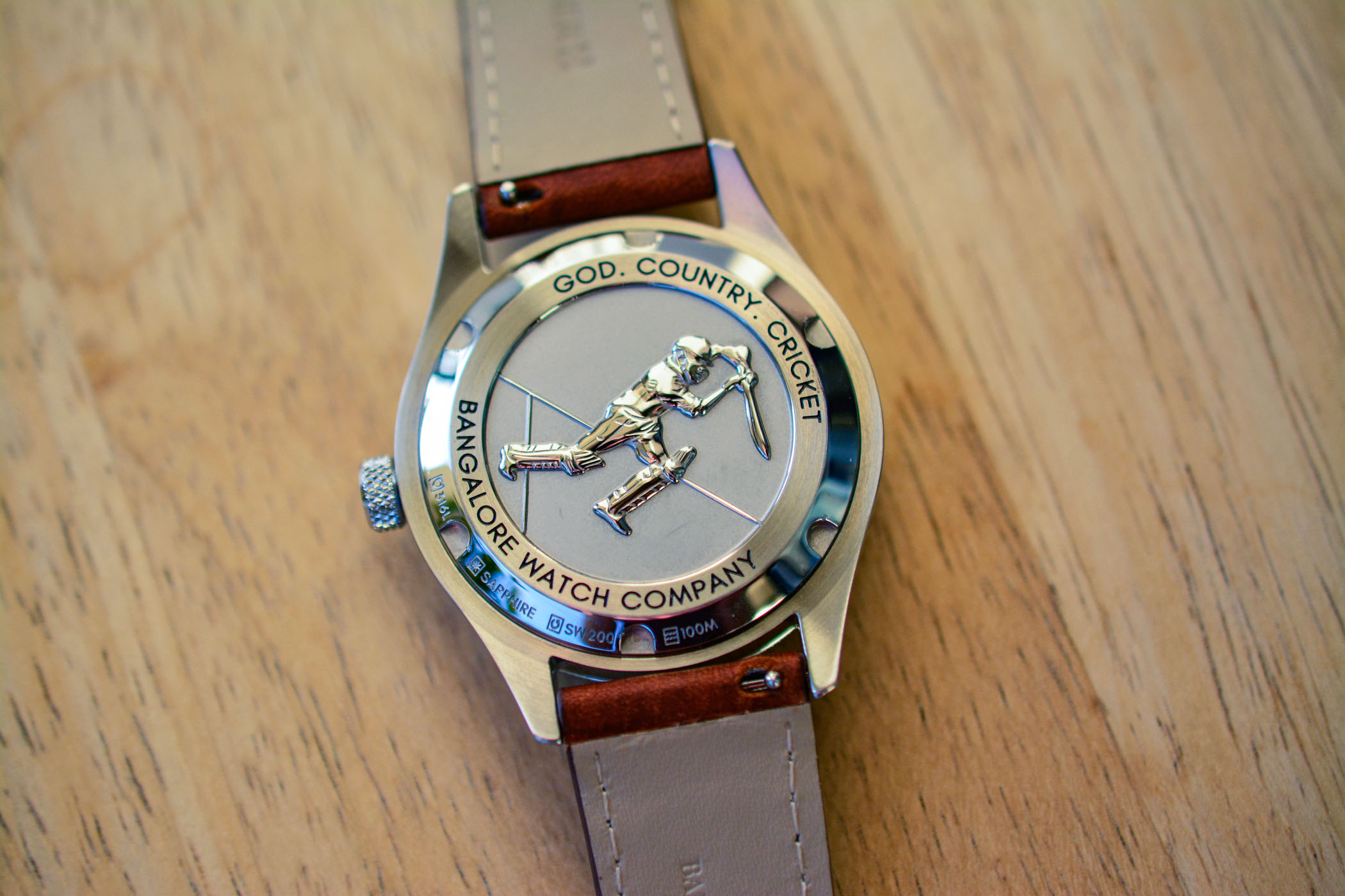 The cricket theme continues with the hands as the counterweight of the seconds hand resembles a cricket bat. The black hour and minute hands are not themed, but large and legible with a full coating of Super-LumiNova. A perimeter minute track sits on an interior flange with a cricket ball image at the top, serving as the starting point for the rotating bezel. Bangalore Watch Company’s logo is applied below 12 o’clock.