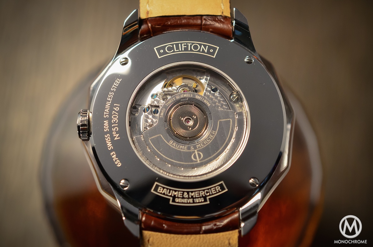 Considering the price-tag and the level of complication that the Baume & Mercier Clifton Retrograde offers, don’t expect to see an exceptional movement here. It applies the same concept that Montblanc uses for its Meisterstück Heritage Perpetual Calendar and Moonphase – a simple and robust base movement with a complication module added on the top, in order to reduce the overall price of the watch. The Clifton Retrograde relies on a Sopord ‘tractor’, the 9094. It’s an ETA 2892 clone that will power the watch for many long years without any issue. It has 30 jewels, ticks at a modern frequency (4hz, 28.800 bph) and boasts 42 hours of power reserve.