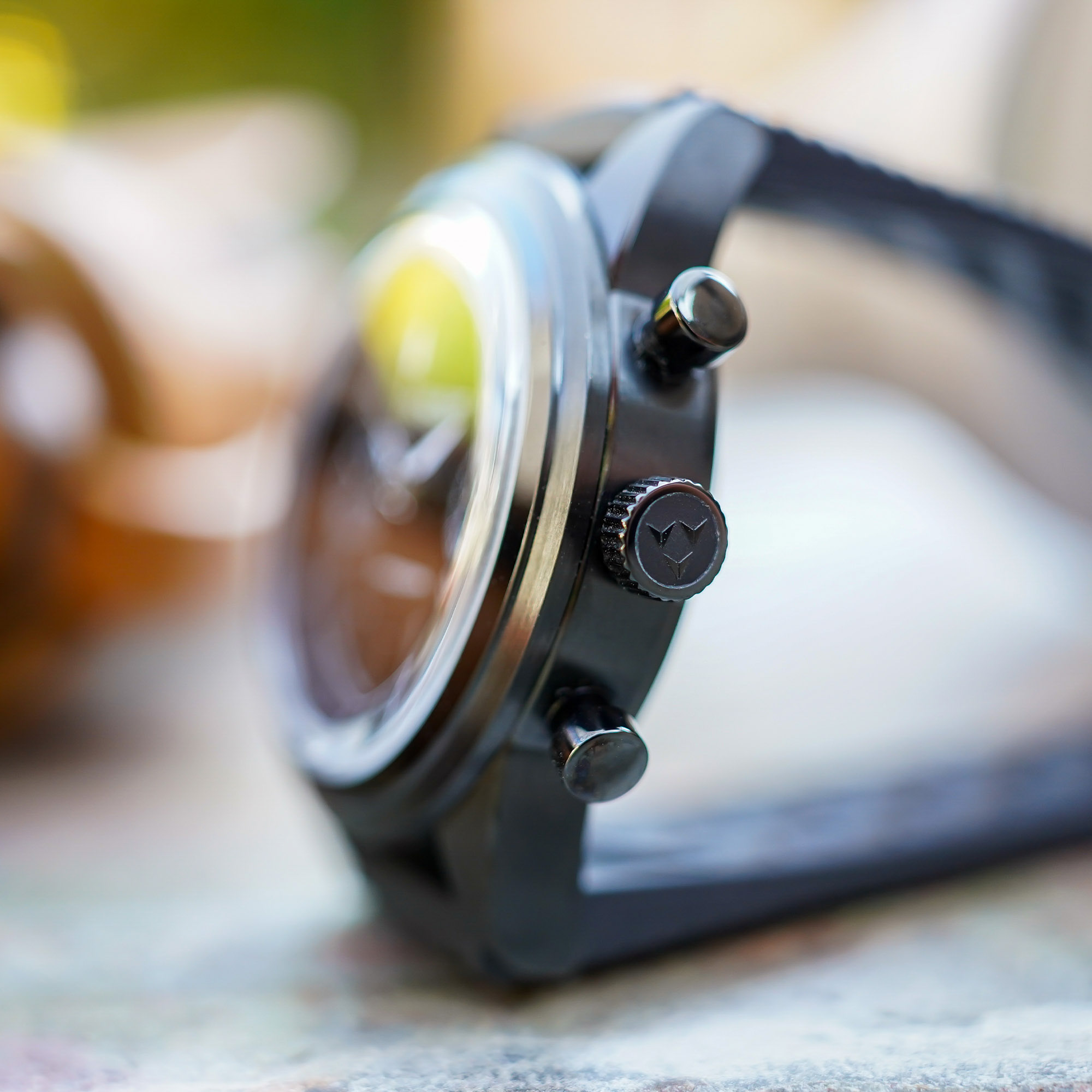 The case has a 39mm diameter and a thickness of 13.8mm, including the double-domed box sapphire crystal. The model we have photographed is the black PVD steel version. The piston-style chronograph pushers underscore a vintage aesthetic, while the dynamic, layered brushed and sandblasted finishes evoke the bold lines and rough concrete finishings of Brutalist architecture. Polished surfaces are used sparingly and the thin polished bevels and stepped inner bezel ring attract light and highlight the more industrial brushed finishings of the case. The caseback is sealed and the case has a water-resistant rating of 50 meters.