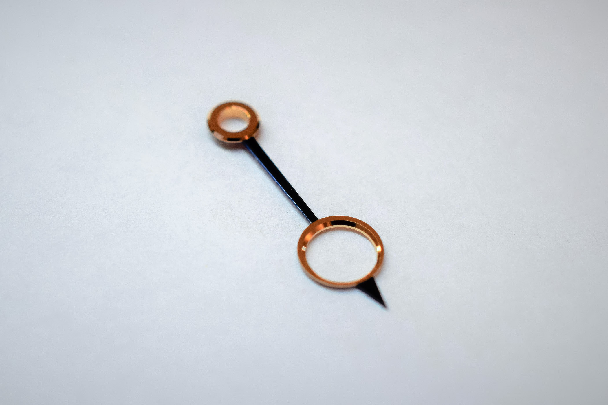 Hands are blued the traditional way at Urban Jürgensen (thermally treated rather than chemically blued). Bluing hands requires a thorough mastery of the process. Bluing steel to a given color can only be achieved by heating the metal to a specific point (around 300°). It is not only decorative, as it also creates a protective oxide layer on the hand, leaving the part much harder and protecting it against rust. At Urban Jürgensen, they aim at reaching the darkest blue, before the color fades and then turns to grey.