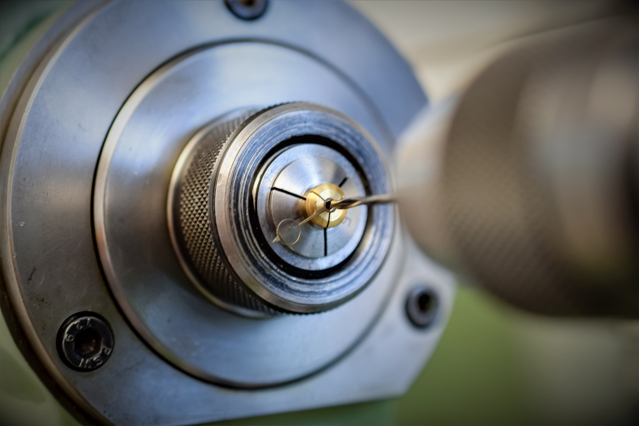 The following step consists of reaming the hand holes to the exact diameter into the hand pipe (canon) and a hand eye (an asymmetrical gold insert) will be affixed at a later stage.