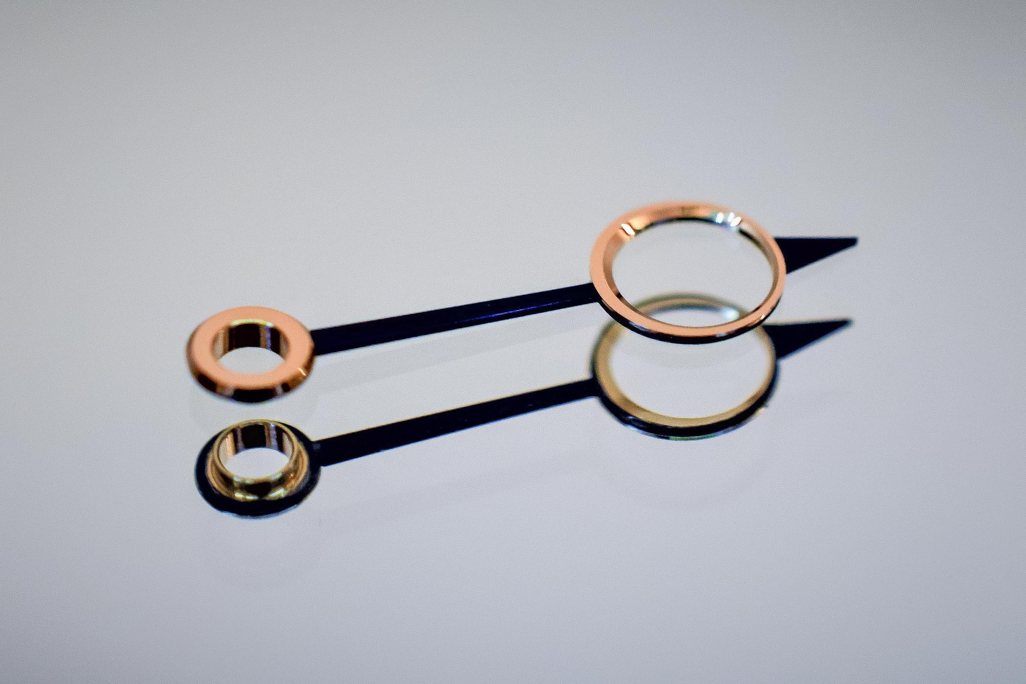 For the hour hand, the gold “eye” is driven into the hole already prepared for it, and is held in place by the sheer accuracy of the fit.