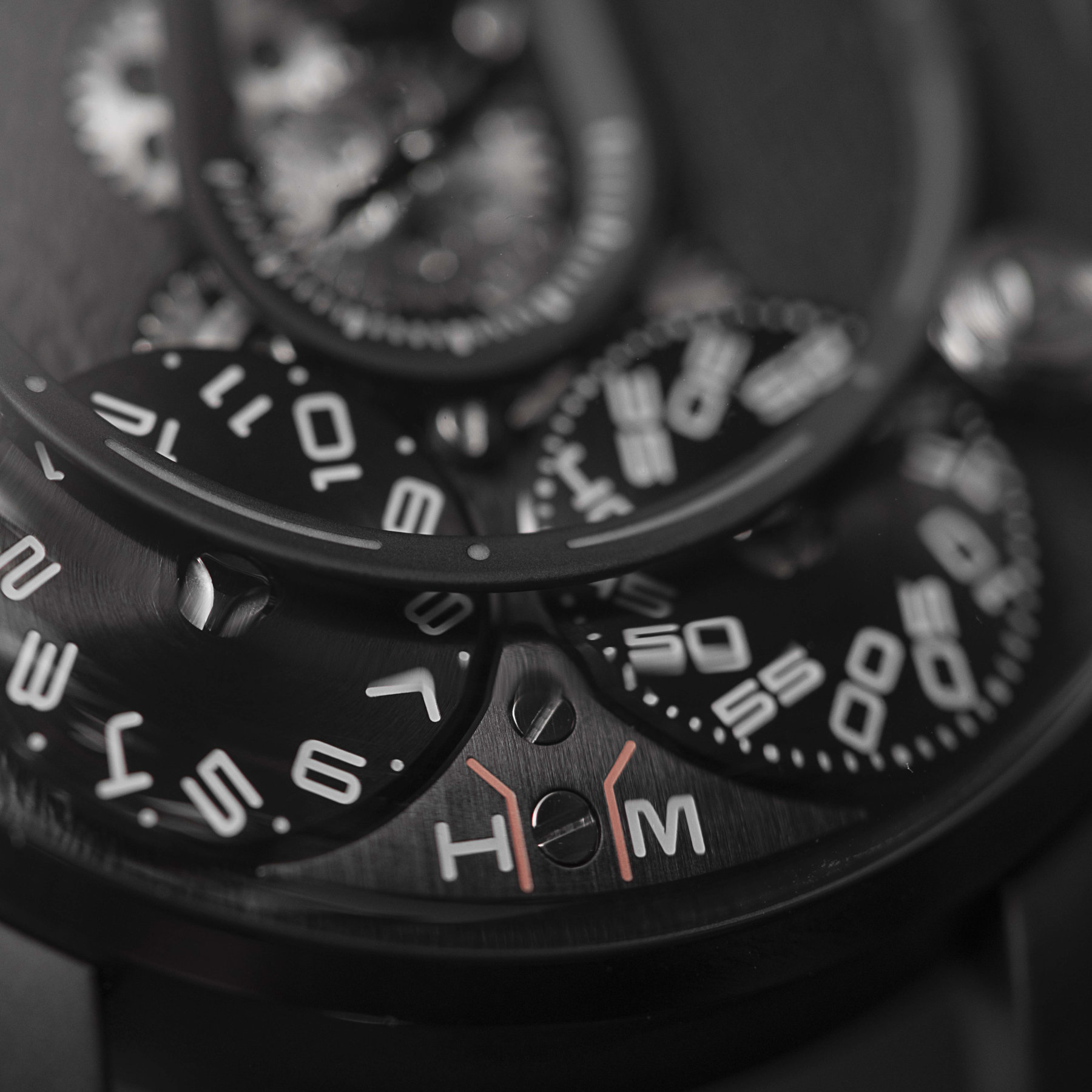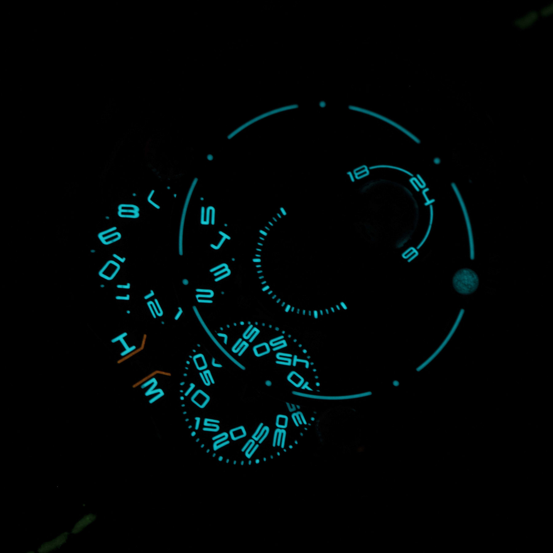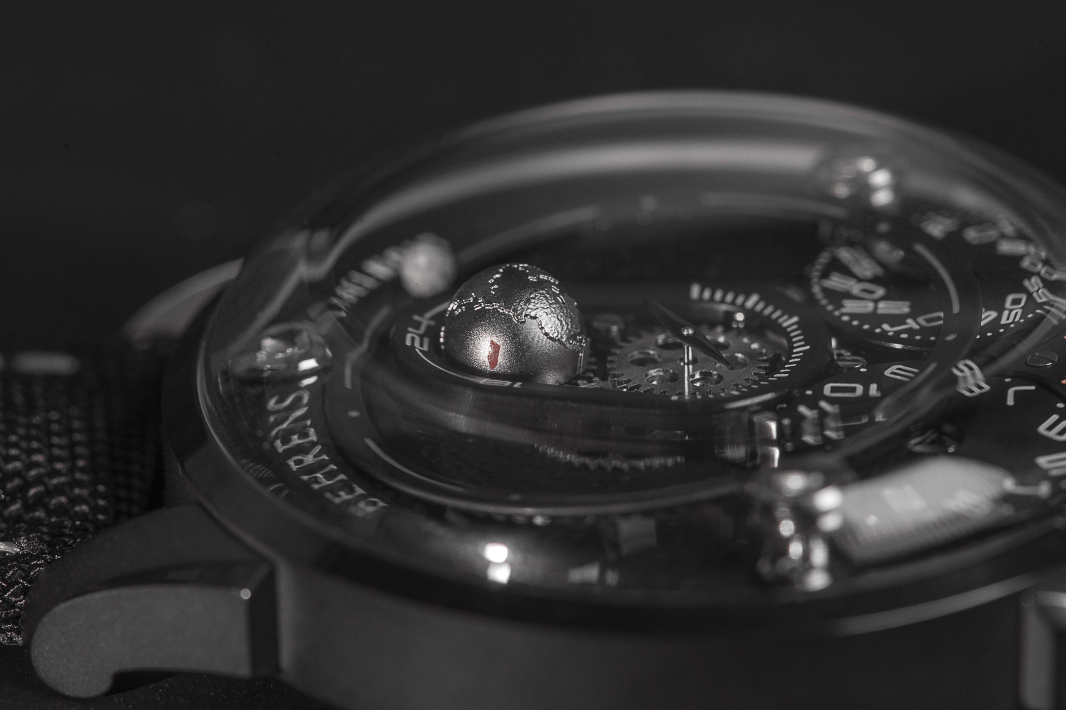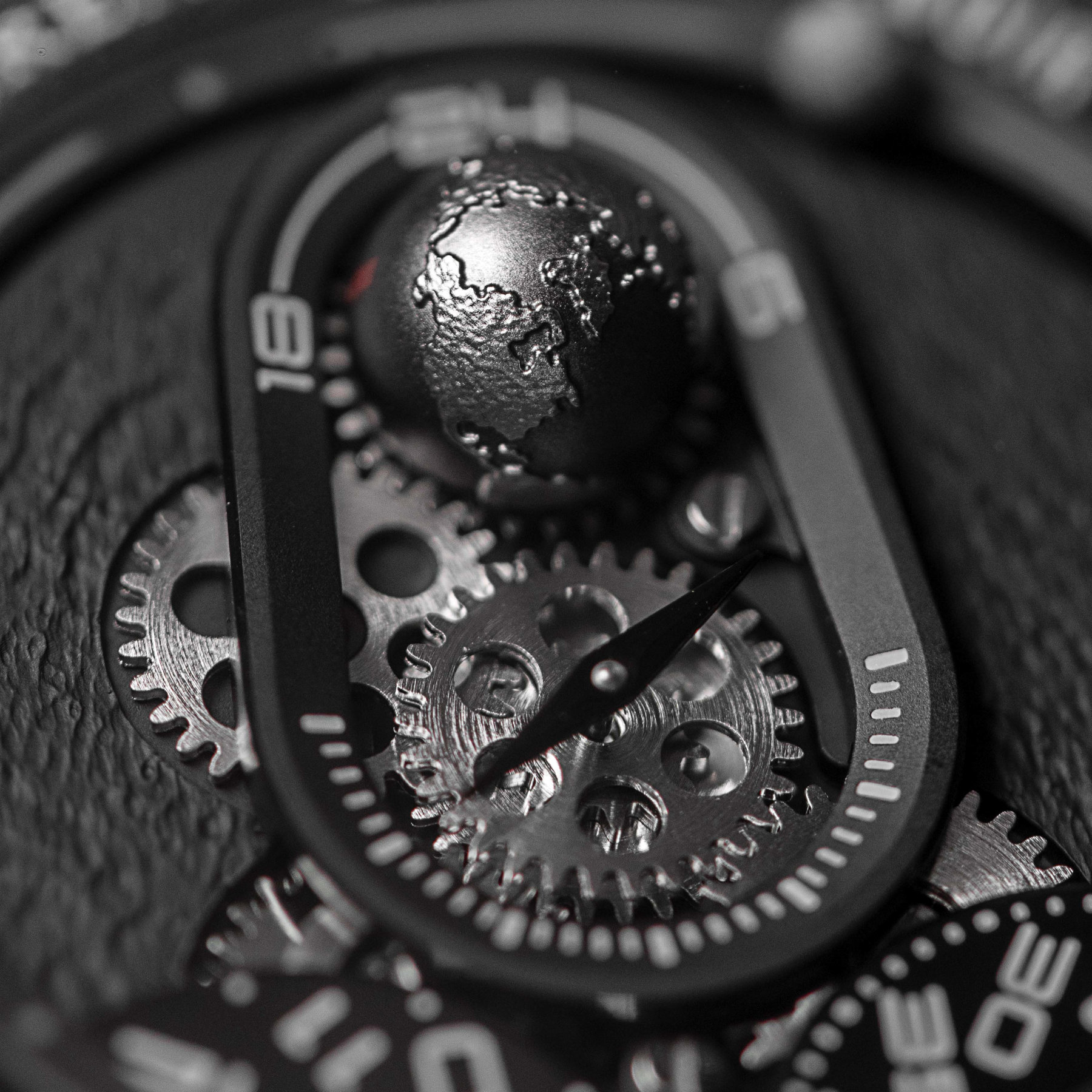 The base dial, in black obviously, has a moon-like texture and acts as the background for the timing display. The most noticeable elements of the dial are the 3D spherical earth, rotating once every 24 hours and adorned with a red marker, the inclined 3D spherical moon rotating in a 28-day cycle, and the two rotating discs in the bottom. The left one indicates the hours, and the right one is for the minutes. Combined, time is read digitally. The final indication is the double-handed seconds hand following a semi-circular track in the centre of it all.