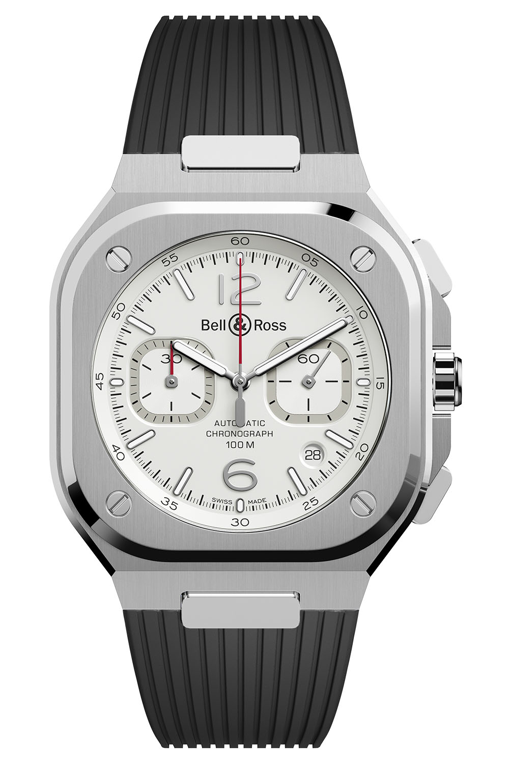 The BR 05 Chrono White Hawk is worn on either an integrated stainless steel bracelet with brushed and polished links, closed by a triple folding clasp, or on a textured black rubber strap closed by a classic folding buckle.