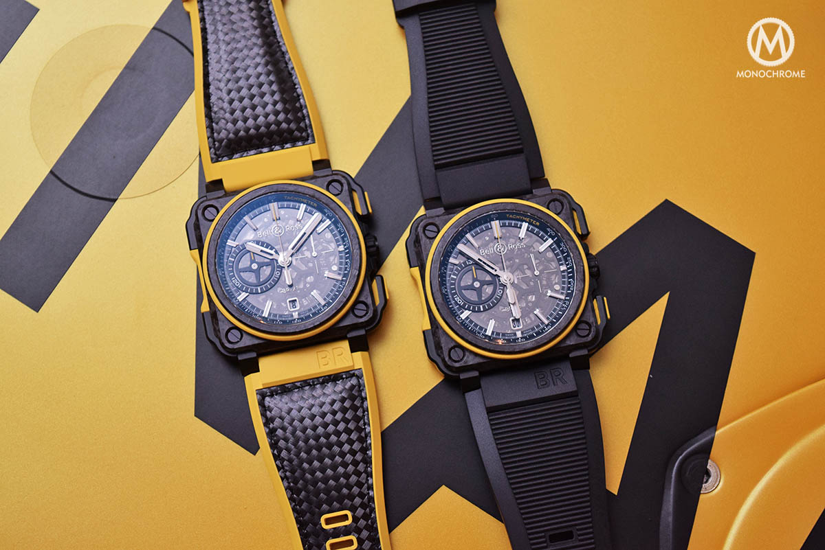 The lightweight black cases now feature yellow touches, where the first BR-X1 Skeleton Chronograph Carbon Forgé was totally black, to the exception of markers and hands. The splash of bright yellow is of course a reference to the Formula 1 racing cars, which actually have sort of a gold, almost pearlescent sheen over it. I can personally vouch for the fact that it’s hardly noticeable on TV, but the watches come quite close to the actual color as you can see in the pictures.