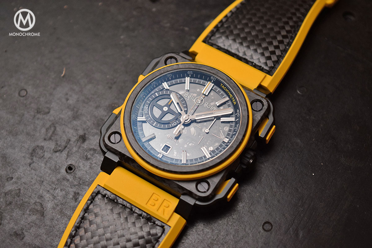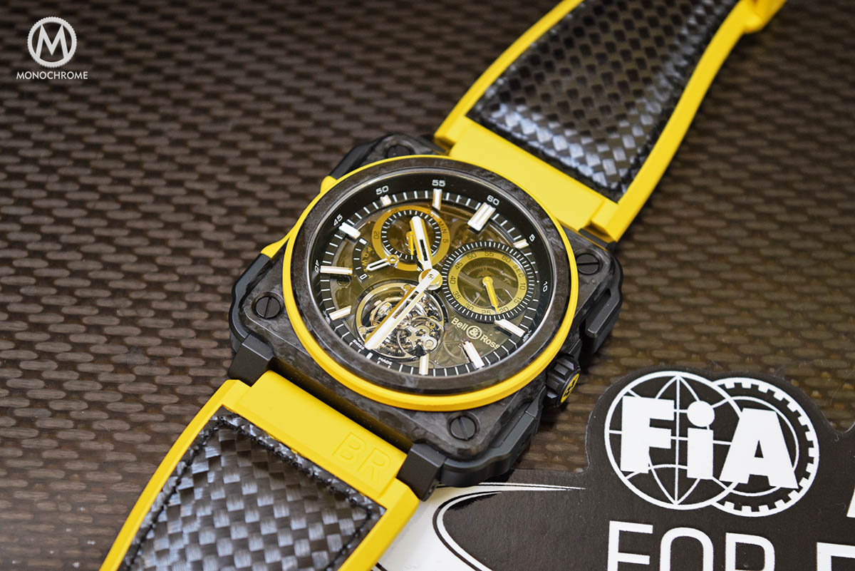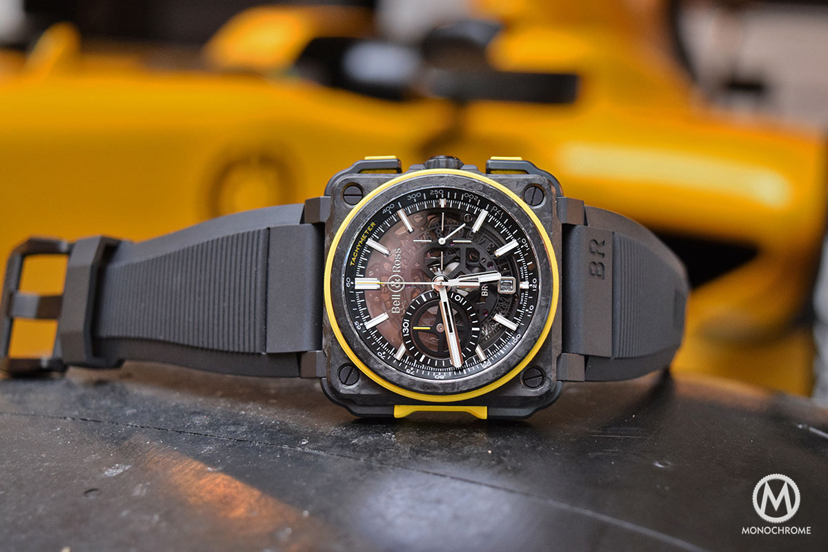 The joint adventure between Renault F1 and Bell & Ross started a new chapter in the brand’s relatively short history – the reasons for this partnership was explained in an interview between Bell & Ross CEO Carlos Rosillo and Monochrome Watches earlier this year. As a hint to this partnership of Bell & Ross (French!) and the Renault F1 team (also French!), the brand introduced bold, quite yellow BR-X1 RS16 and RS16 Tourbillon limited editions. While the technology and specifications are not new, it does offer a very sporty rendition of the common theme within the BR-X1 line-up. Both the regular BR-X1 RS16 and the Tourbillon BR-X1 RS16 are equipped with a chronograph movement, housed in a square forged carbon case of 45mm wide.