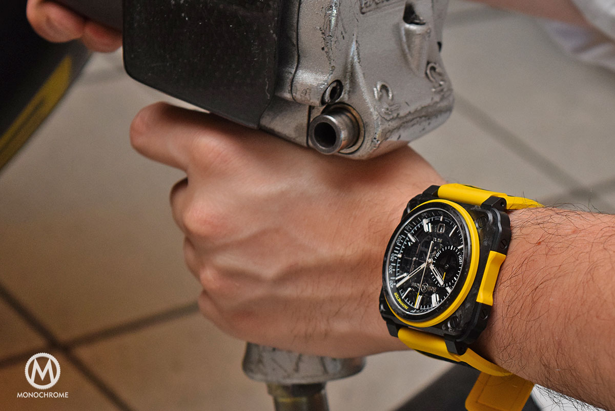 The Bell & Ross BR-X1 RS16 and RS16 Tourbillon is fitted on a yellow rubber and carbon fiber strap, but the brand will supply you with a full black rubber strap if desired (as can be seen in some pictures) when the yellow one is a bit too, let’s say, funky for your liking. Bell & Ross only offers these watches in limited edition – 250 pieces for the Bell & Ross BR-X1 RS16 Skeleton Chronograph and 20 pieces for the RS16 Tourbillon, available only in the paddock of each Formula 1 race. As for the price, the Skeleton Chronograph is 22,000 Euros and the Tourbillon is 155,000 Euros.