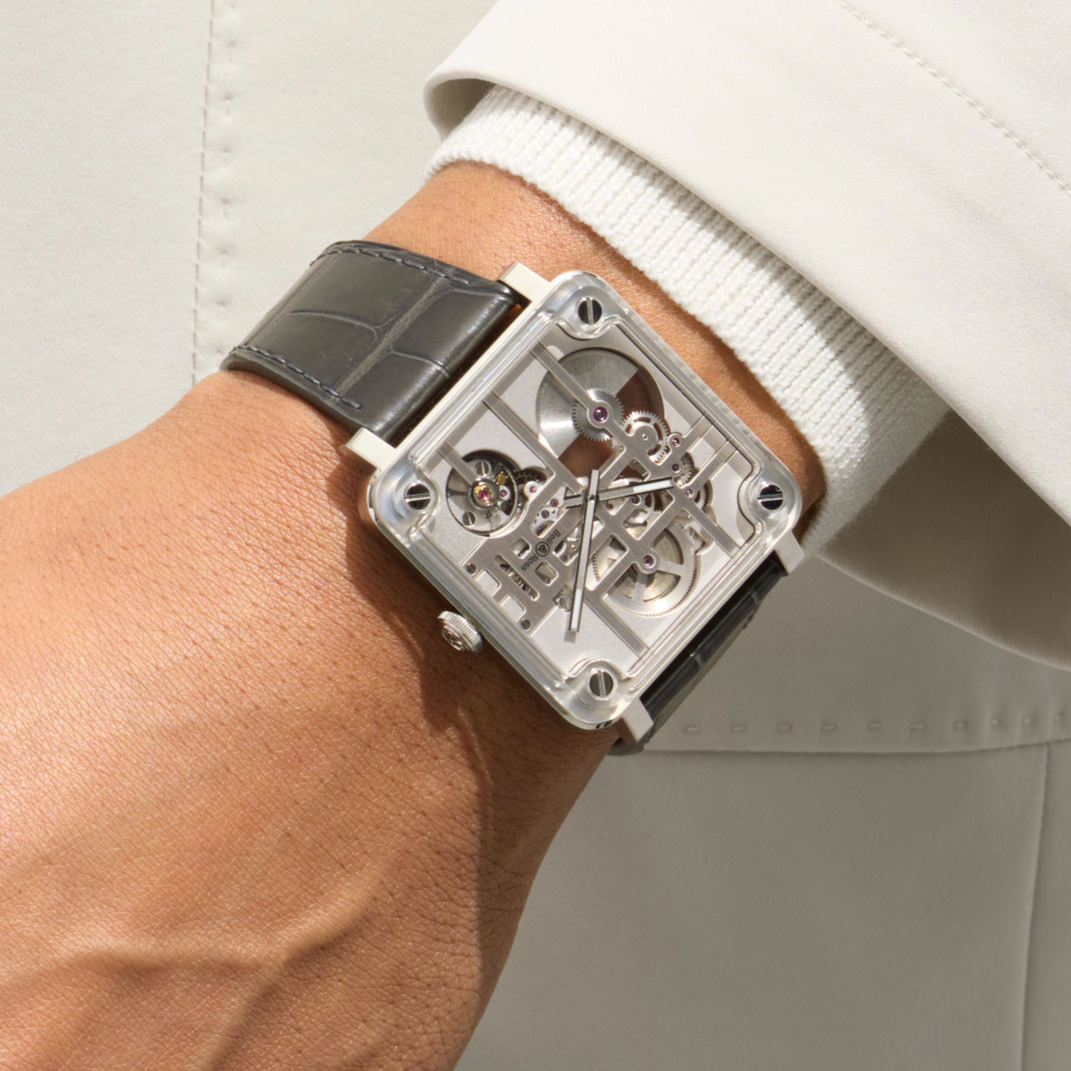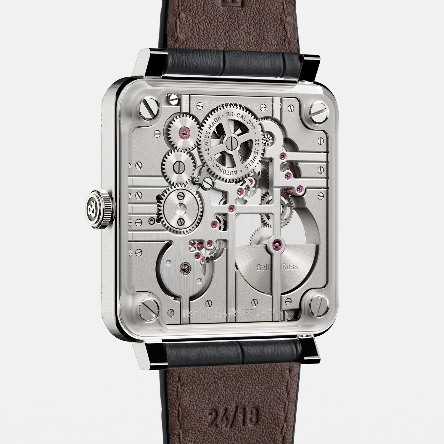 The 40mm steel case comes with satin finishing and polishing, and follows the familiar BR-03 shape, with its four exposed screws and a square profile. In this setup, the case and movement are built together as one unit, with the central plate acting as both structure and base. Sapphire crystals on both sides keep everything visible, and light can also move across the different surfaces and finishes throughout the BR-X3 Micro-Rotor.