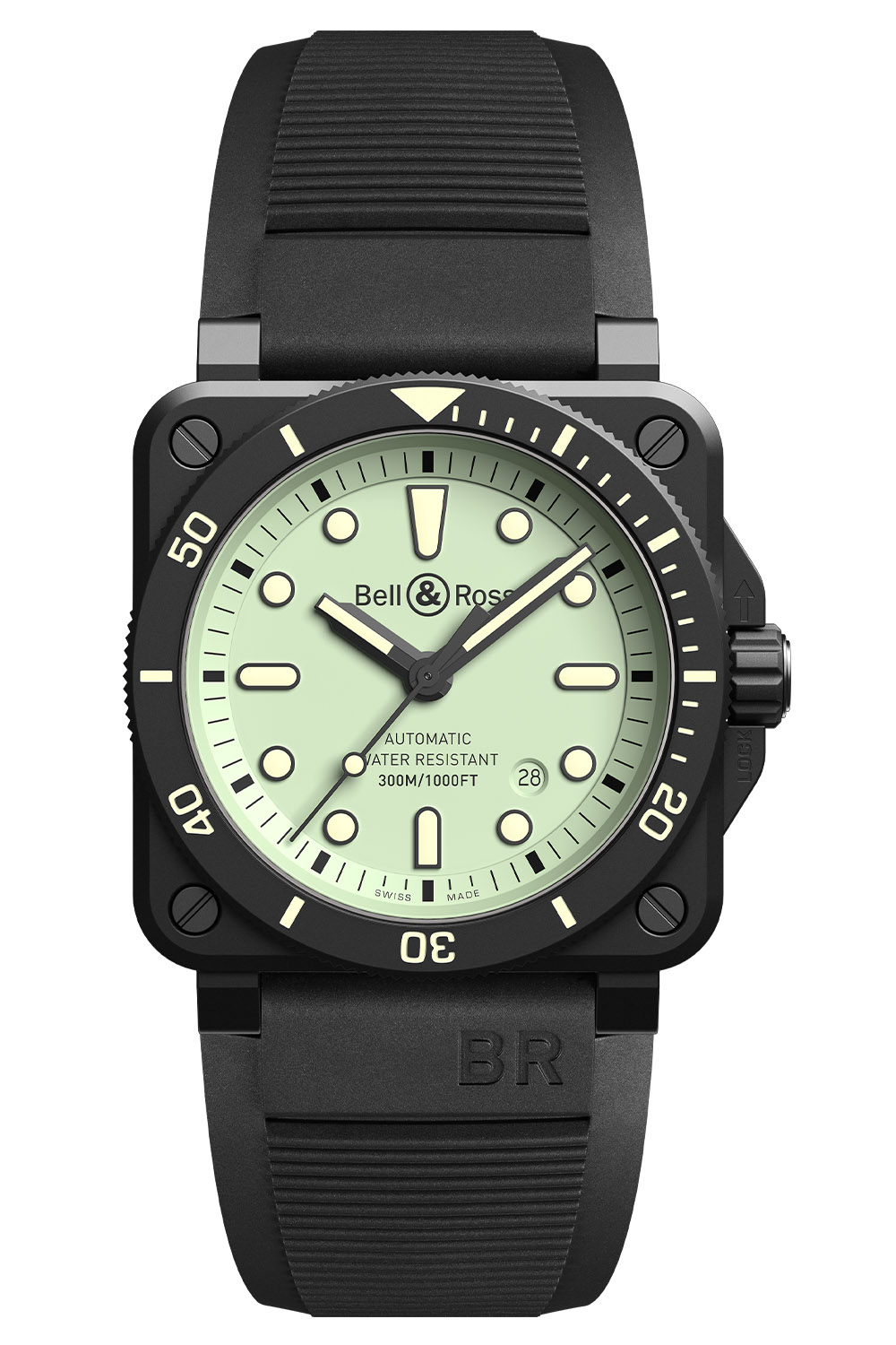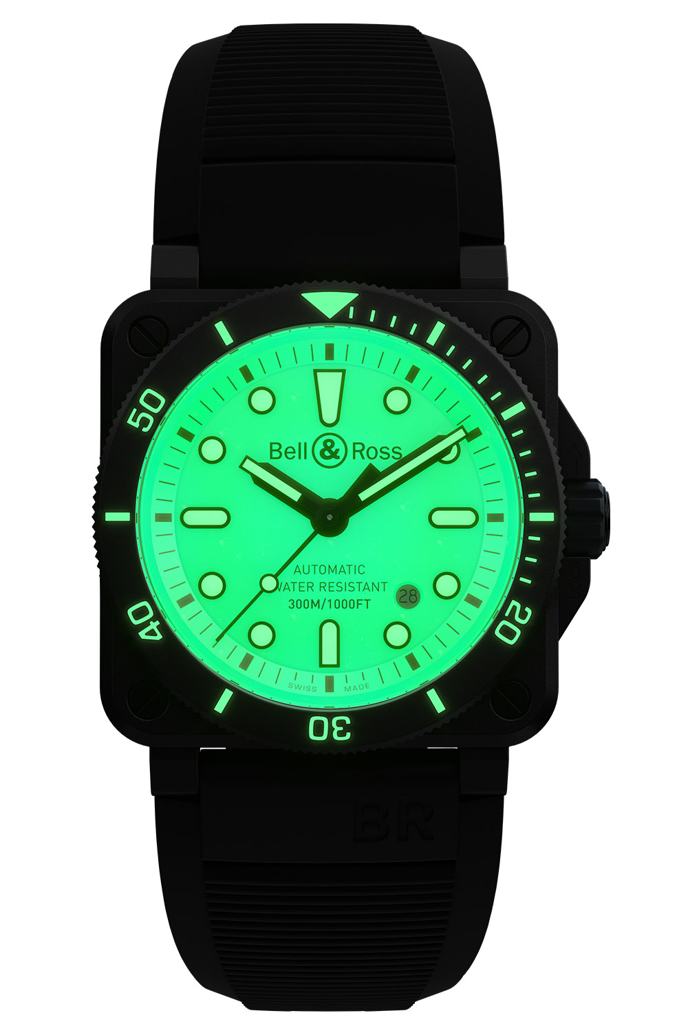 Fitting a circle within a square is no simple task… And when you add the fundamental elements of a dive watch to the mix, including the required rotating bezel, this makes the task even more complex. Yet, this is what Bell & Ross has done with its BR 03-92 Diver, successfully mixing the iconic BR case with diving features. Today, the brand adds its ‘LUM’ concept to this watch, with the new Bell & Ross BR 03-92 Diver Full Lum… Shine a light!