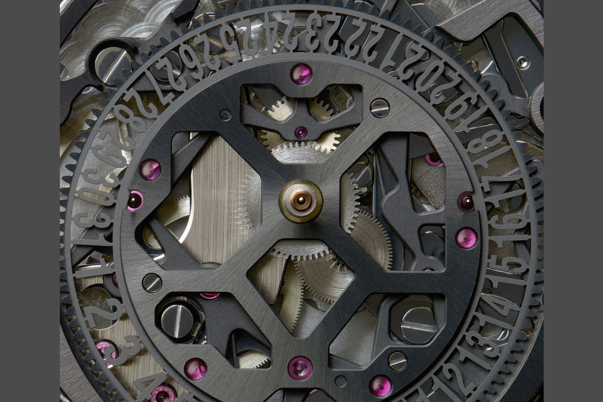 The case of the Bell & Ross BR-X1 uses the classical and iconic design of B&R – meaning a square box with a round dial aperture, inspired by on-board instruments – with a more complicated conception. The grade-5 titanium case measures 45mm. It is light but has a high level of protection, due to the black ceramic protective band. Ergonomic was also part of the concept: the places where fingers should sit are highlighted in red rubber (for the pushers and the recessed part at 9 for the thumb) for a better grip, even with gloves (remember that Bell & Ross creates watches that are effectively used by pilots and special forces). This combination of a strong, sporty and resolute design reminds us of course of the Hublot King Power or the Audemars-Piguet Royal Oak Offshore. But in order to compete such icons, a design and materials are not sufficient the only requirement. What ticks inside the Bell & Ross BR-X1?