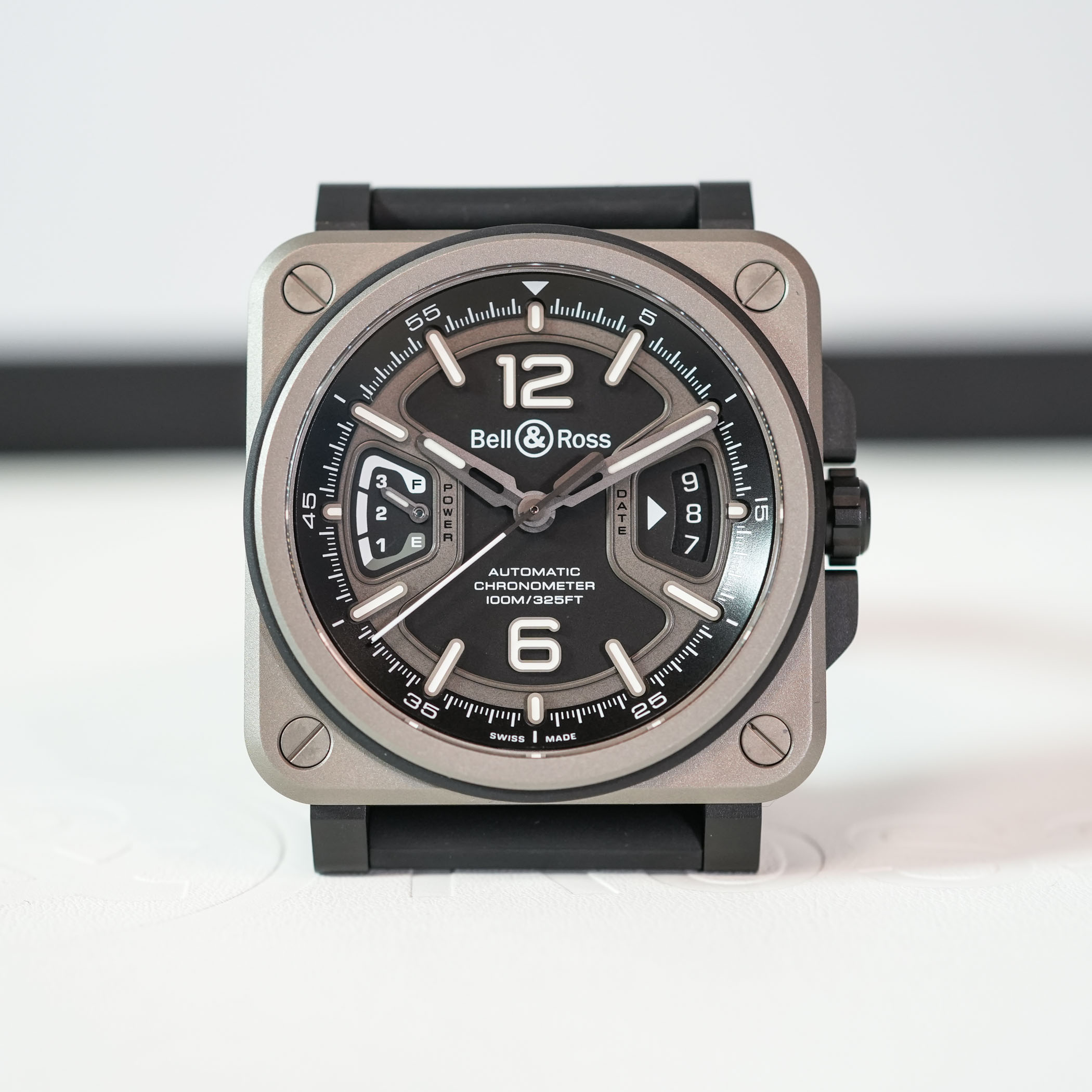 The circular bezel sits atop a blue coloured plinth on the steel model, and a black one on the titanium version. Then comes the horizontal case top, with the signature functional screws on the corners, before things take a slightly different direction. Sandwiched between the top and bottom sections of the case is a round barrel for the dial and movement, with pillars on each corner. On the other end of the case, we see a typical B&R-style screw-down crown sandwiched between stout and angular guards in steel or in black-DLC coated titanium, depending on the version.