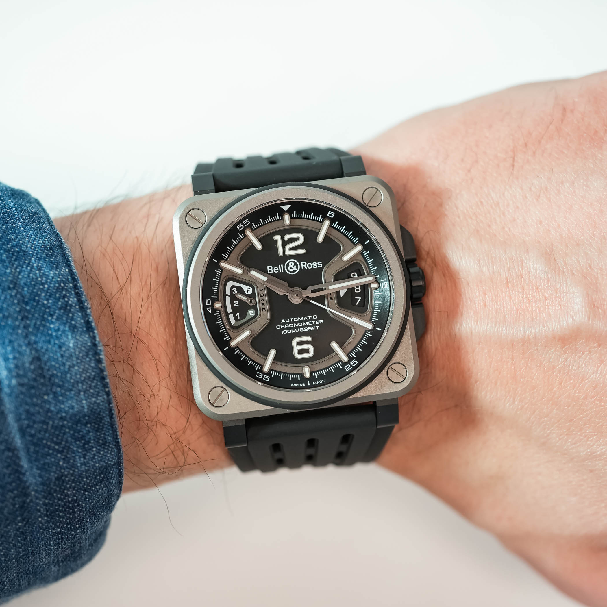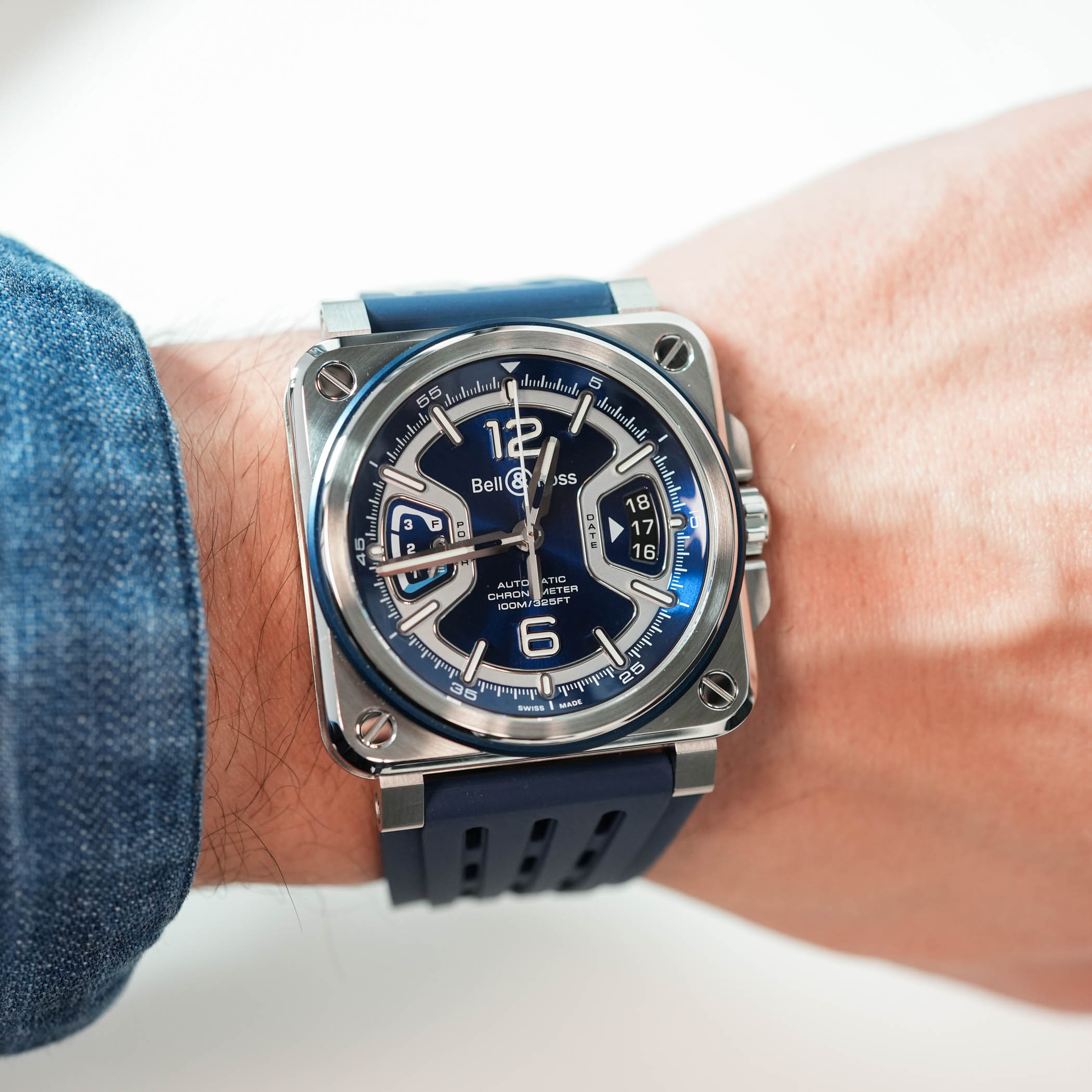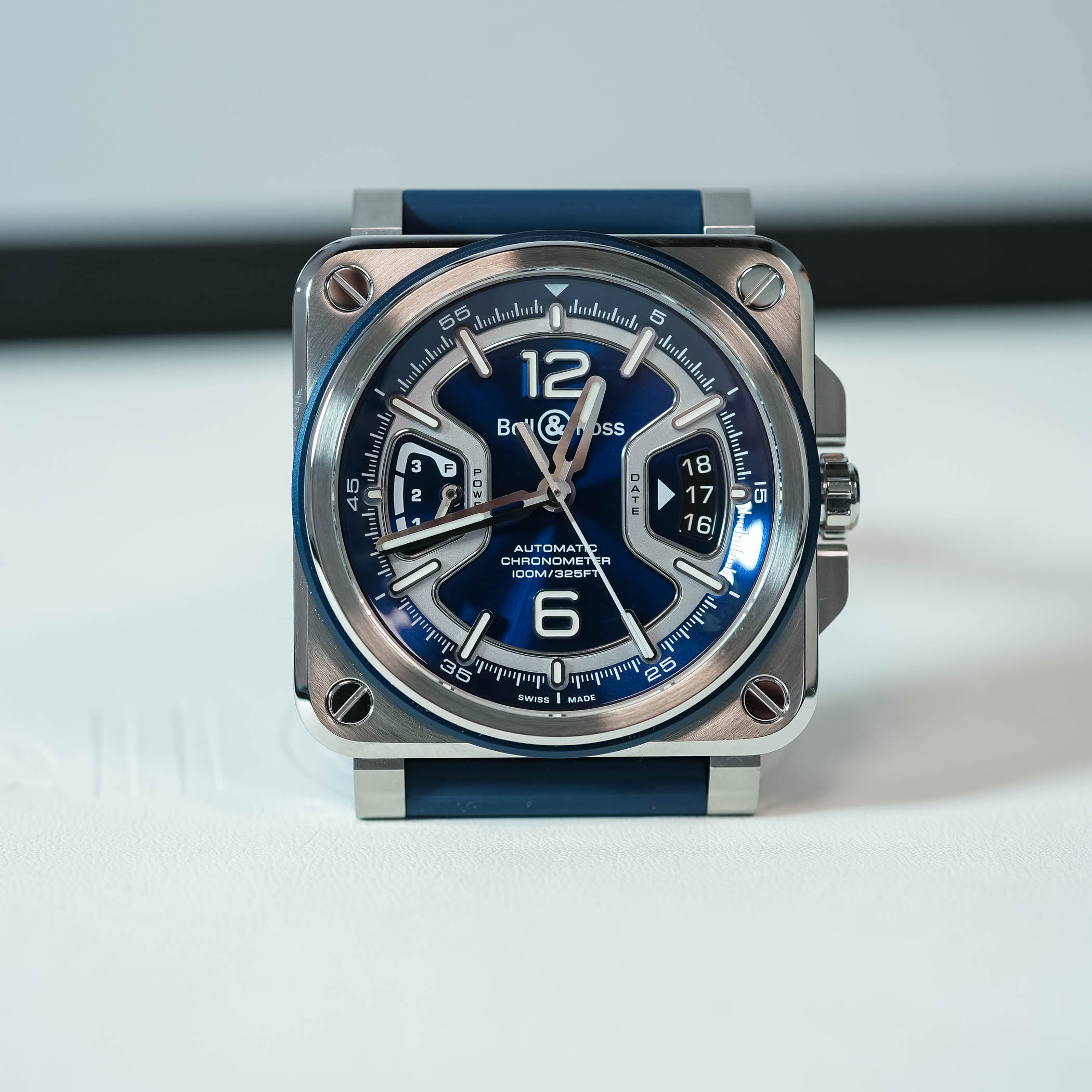 On the Black Titanium edition, everything between the top and bottom layers is… blackened, as you’d expect. On the steel version, only the pillars, in anodised aluminium, have been given a touch of blue. This interplay of shapes and colour gives the BR-X3 its own unique character within the BR universe, which is pretty neat. The rest of the case is classic for the brand, with short lugs, sapphire crystals on both sides and a comfortable 100m water-resistance.
