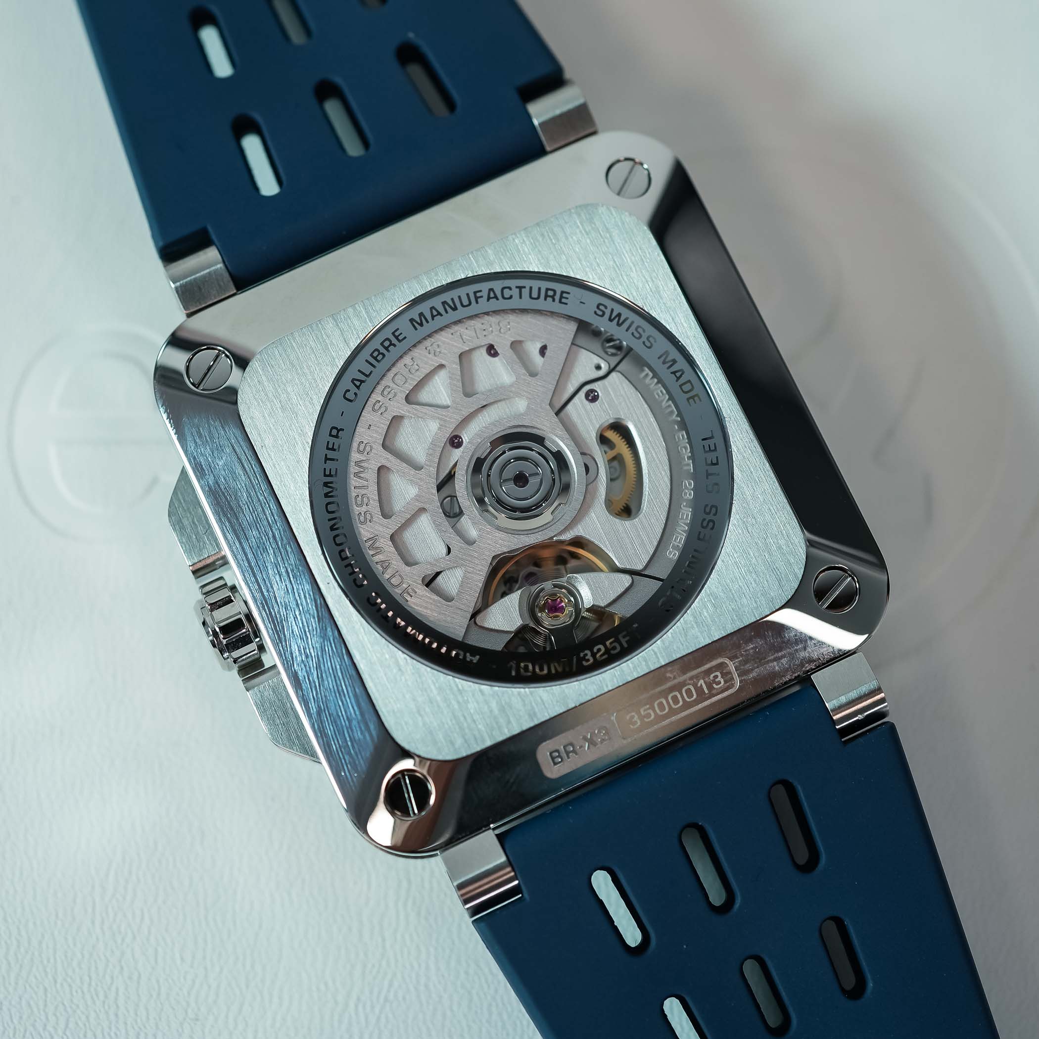 Moving to the back side of the BR-X3, a clear (Blue Steel) or tinted (Black Titanium) sapphire crystal reveals the BR-Cal.323. This manufacture movement is made together with Kenissi, which is partially owned by Chanel, who also has a majority share in Bell & Ross. It relies on the same technical base as the movement found in the BR-X5, as well as watches from Tudor and Norqain.