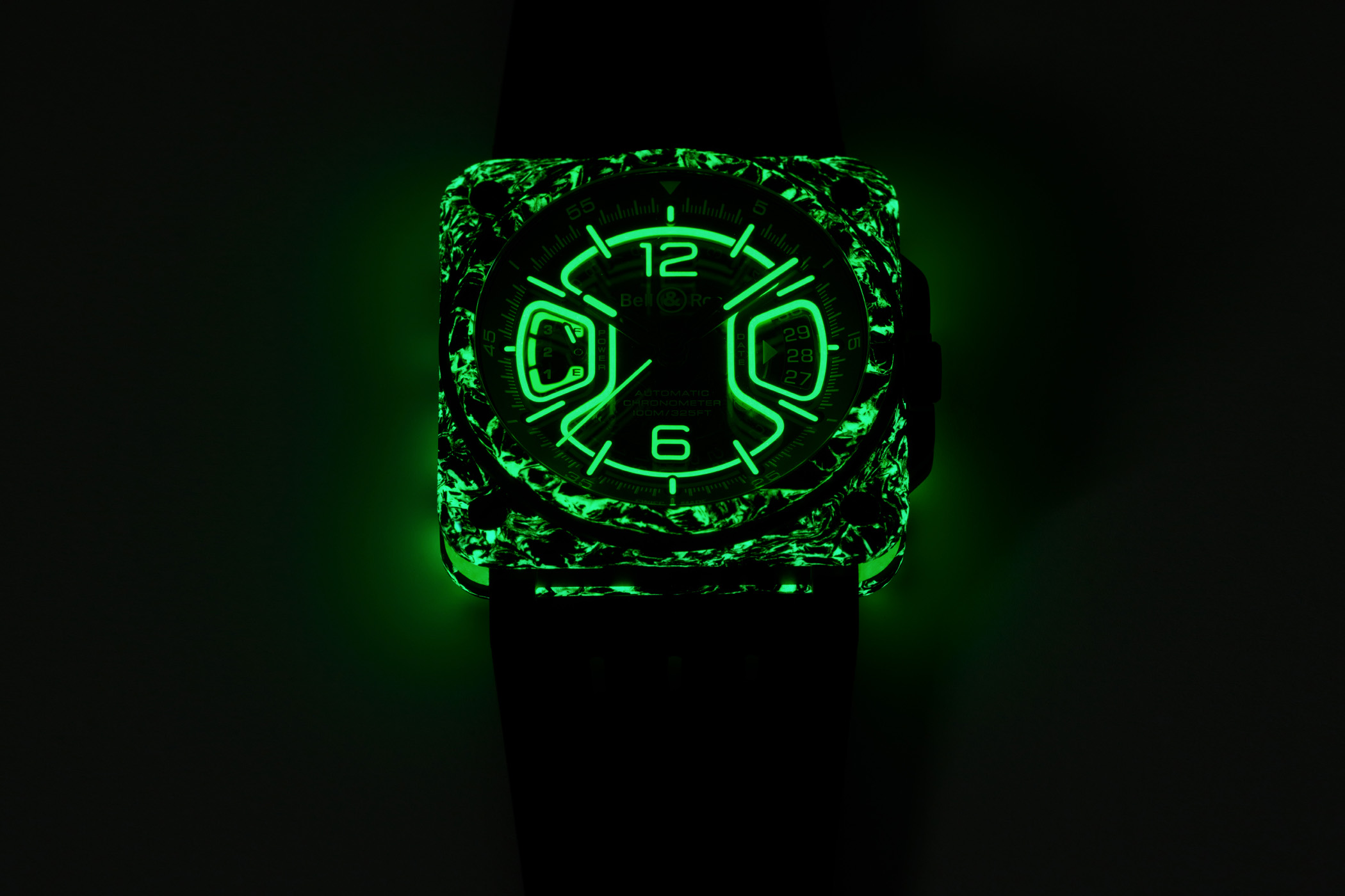 A classic example of a watch with a dual personality… Already bold during the day, the BR-X3 Night Vision reveals its true nature at night, thanks to the use of luminescent material on nearly all surfaces. This is not a first for the brand, which has extensively endorsed the use of Super-LumiNova, first with the LUM collection and later with full-lumed dials or fully luminescent cases. About a month back, Bell & Ross presented the BR-X3 collection, a technical, more radical take on the classic squared watch, with more power under the hood, a more complex openworked display and a case construction that allows for material evolutions.