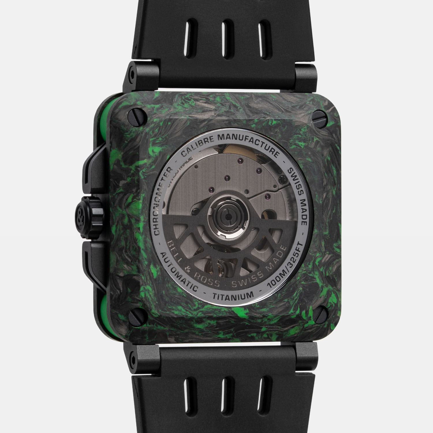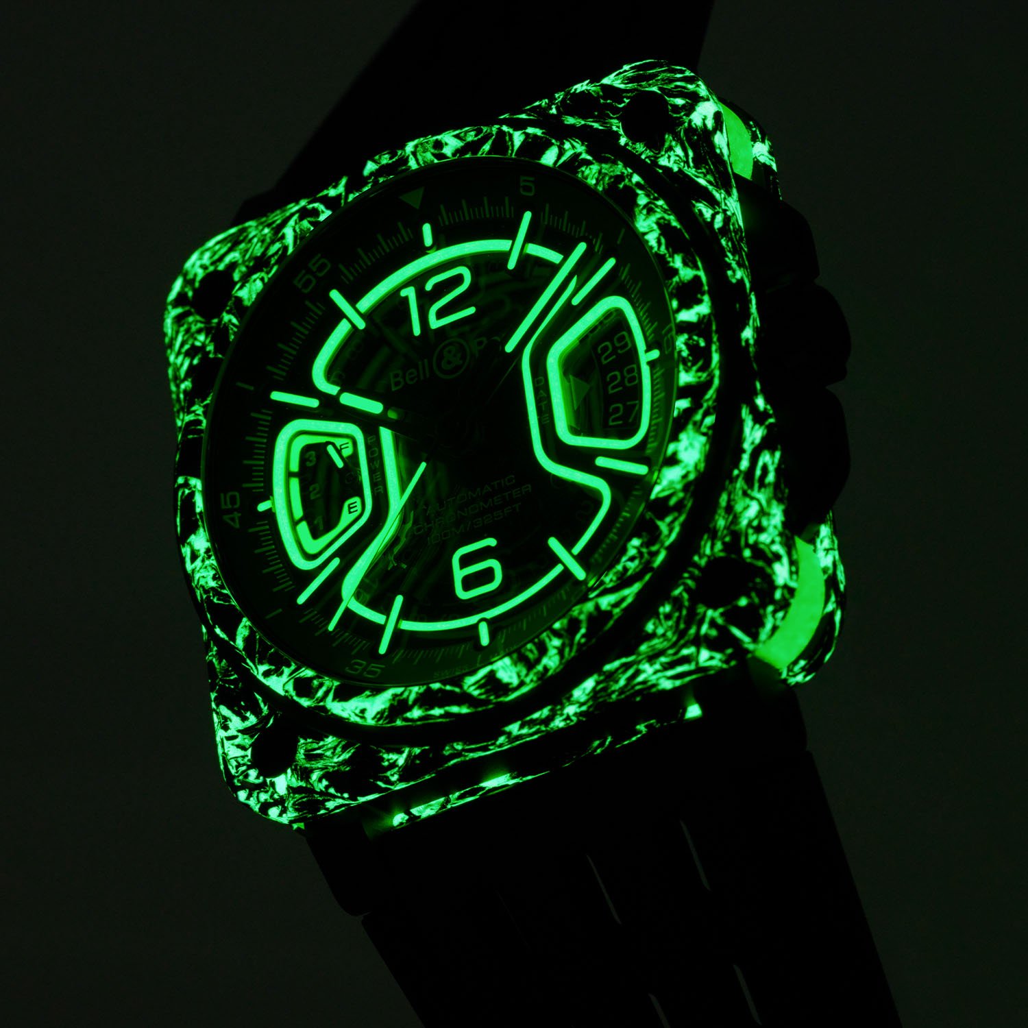 Speaking of which… Based on the visual efficiency of head-up night displays, the classic steel or titanium BR-X3 evolves into something much more technical and visually bolder as well. Now cloaked in a luminous, techno-futuristic camouflage, the case of the BR-X3 Night Vision relies on a sandwich construction, with the top and bottom plates made from LUM-CAMO, a high-tech composite that combines carbon fibre with a blend of Super-LumiNova resin. Black with discreet green inclusions during the day, the material shines bright at night. The plates are then fastened with four through-screws housed in protective cylinders, which are made of photoluminescent green rubber. The middle case is made of PVD-coated titanium.