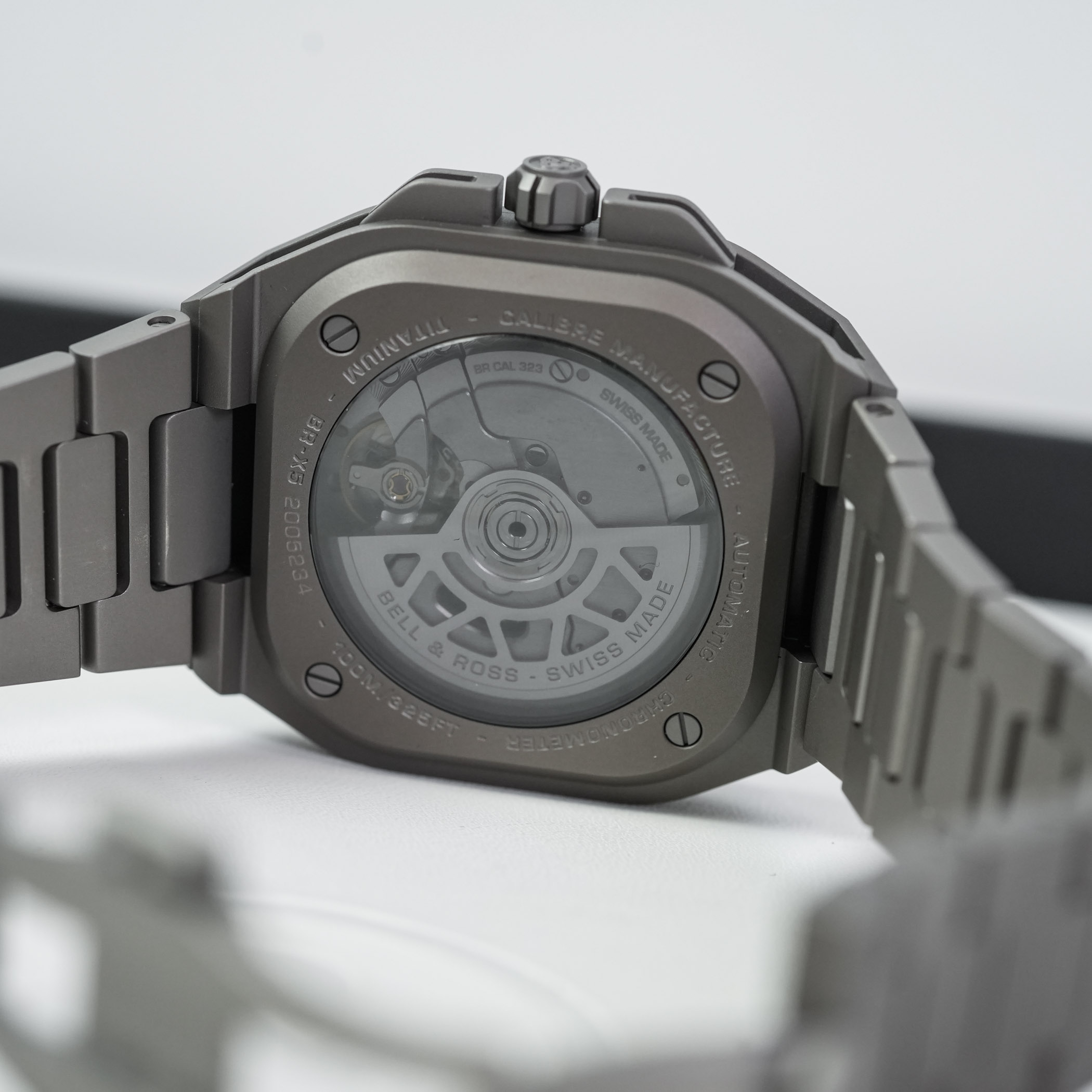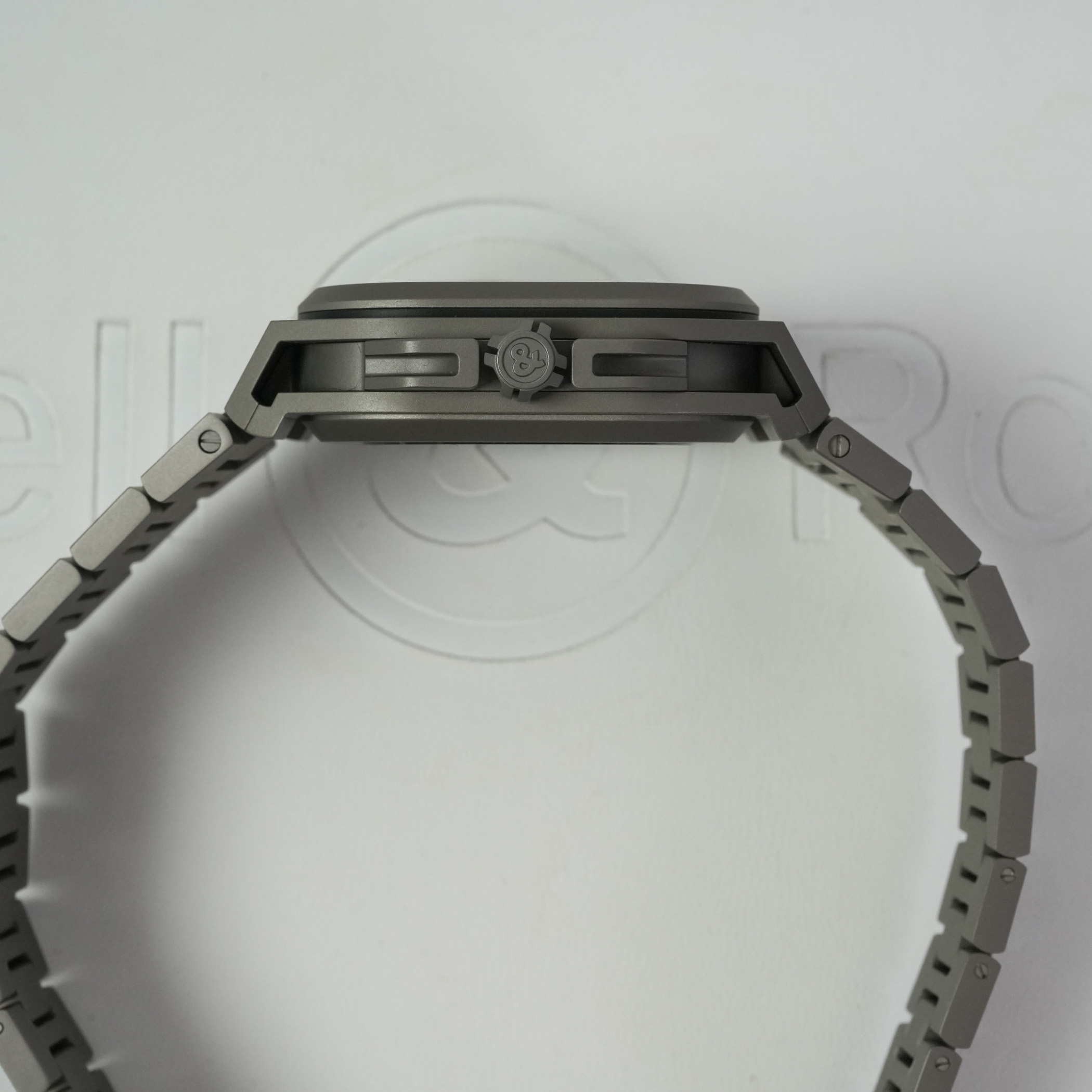 The 41mm case’s multi-component architecture benefits from titanium’s lightweight, performance-driven properties. Used widely in aeronautics, titanium is hypoallergenic, non-corrosive, non-magnetic, and three times lighter than steel. Crafted entirely in grey, grade 2 titanium, the case and bracelet of the BR-X5 Black Titanium have been micro-sandblasted to produce the non-reflective, matte, slightly grainy finish. Robust to the core, the complex 12-part sandwich construction is assembled around a waterproof container containing the manufacture movement. The signature square bezel and sapphire glass are fixed to two titanium plates to form the top and bottom of the case, secured with four screws. This construction guarantees the 100m water-resistance and makes the case extremely resilient.