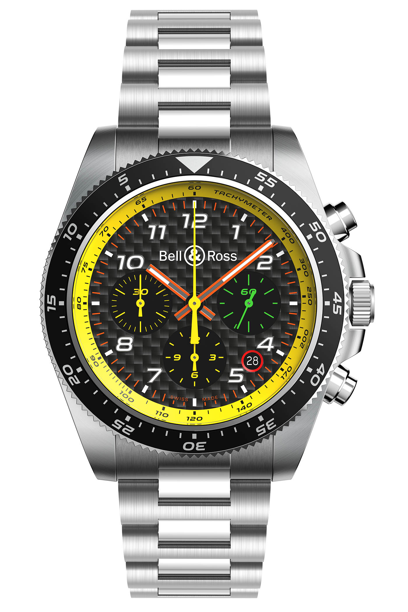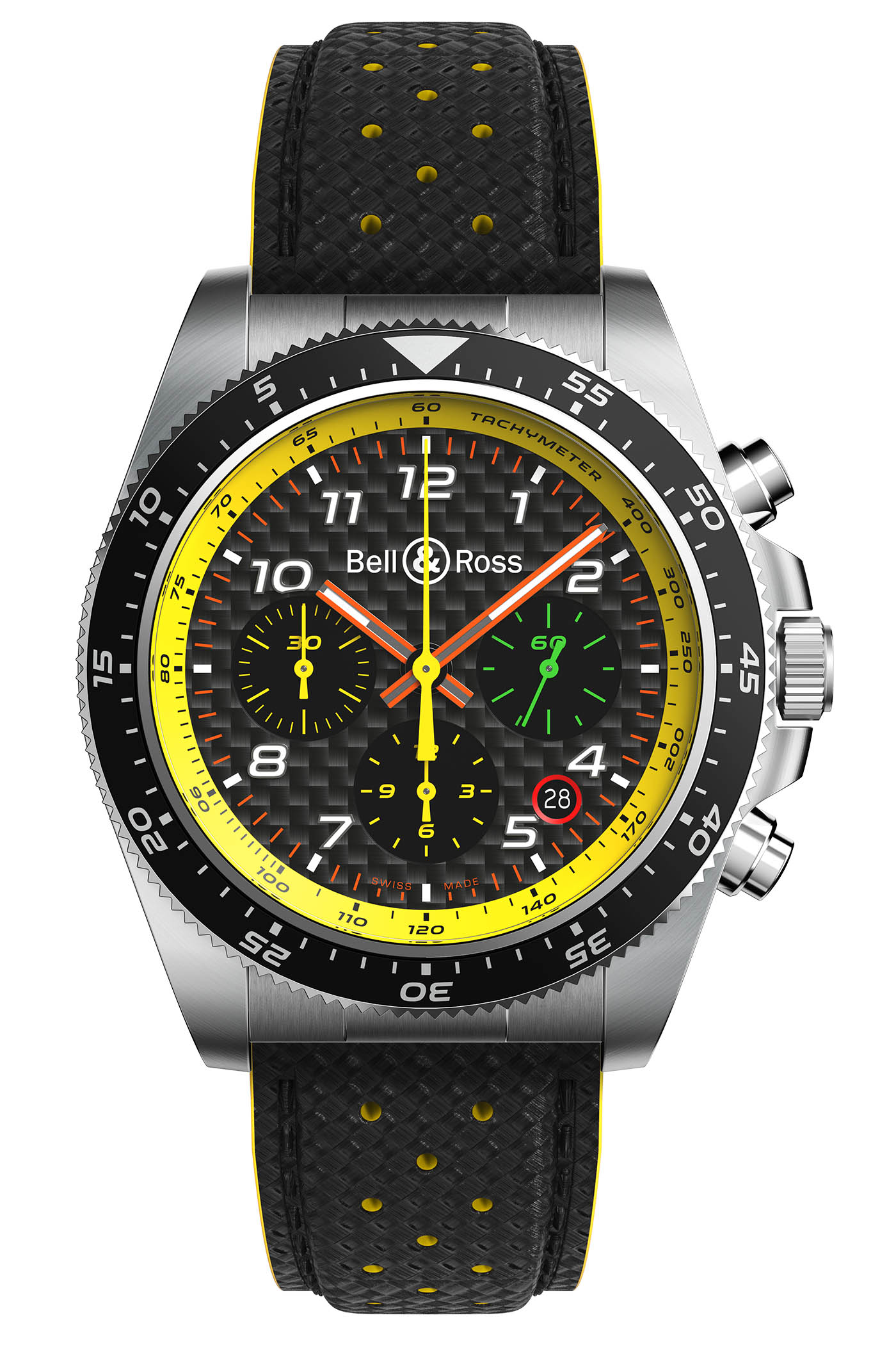 The Bell & Ross BR 03-94 R.S.19 features a 30-minute and 12-hour chronograph display on a carbon fibre dial, with yellow (tachymeter scale, sub-counters) and red accents (hands and date). It shares the same engine as above and will be delivered on a perforated rubber strap.