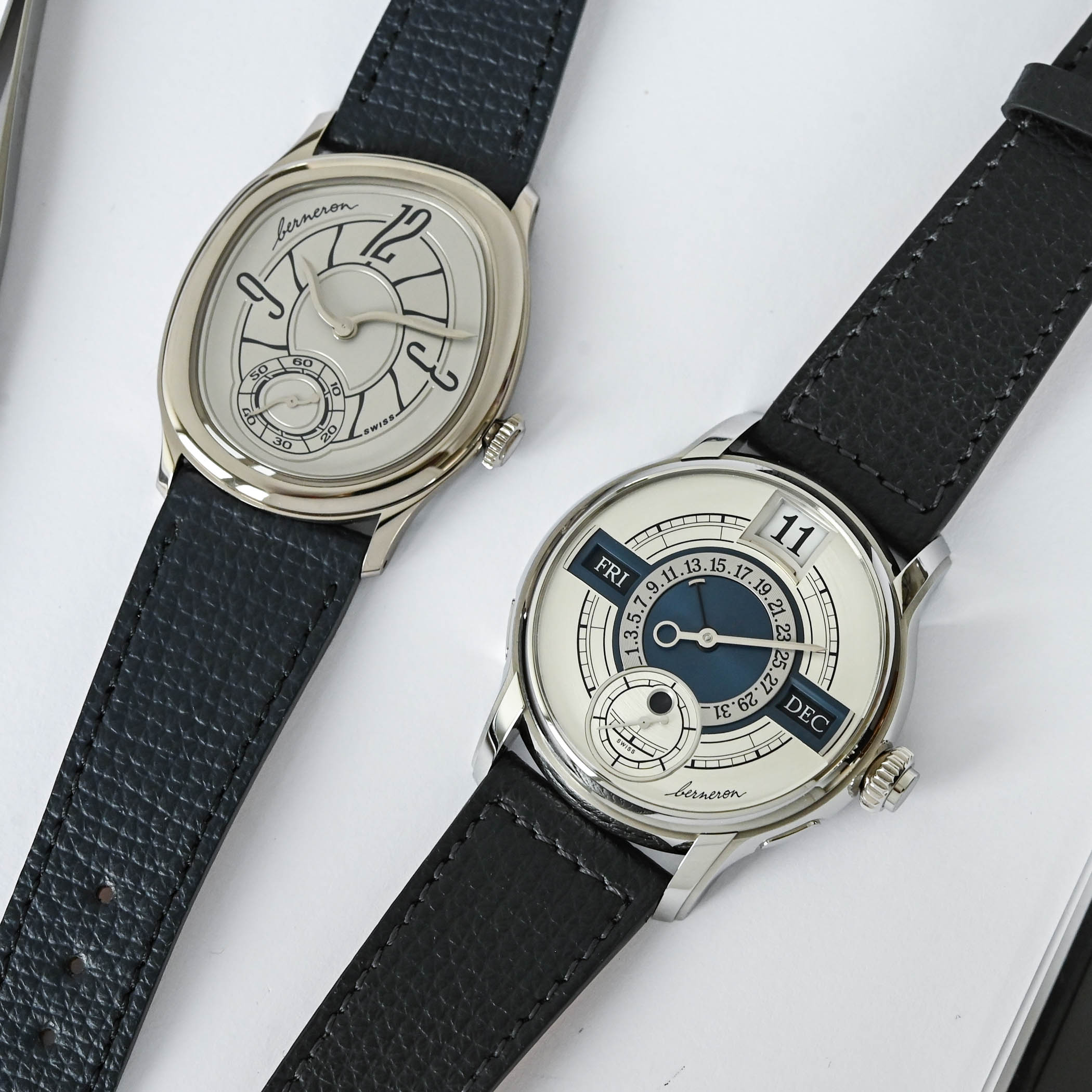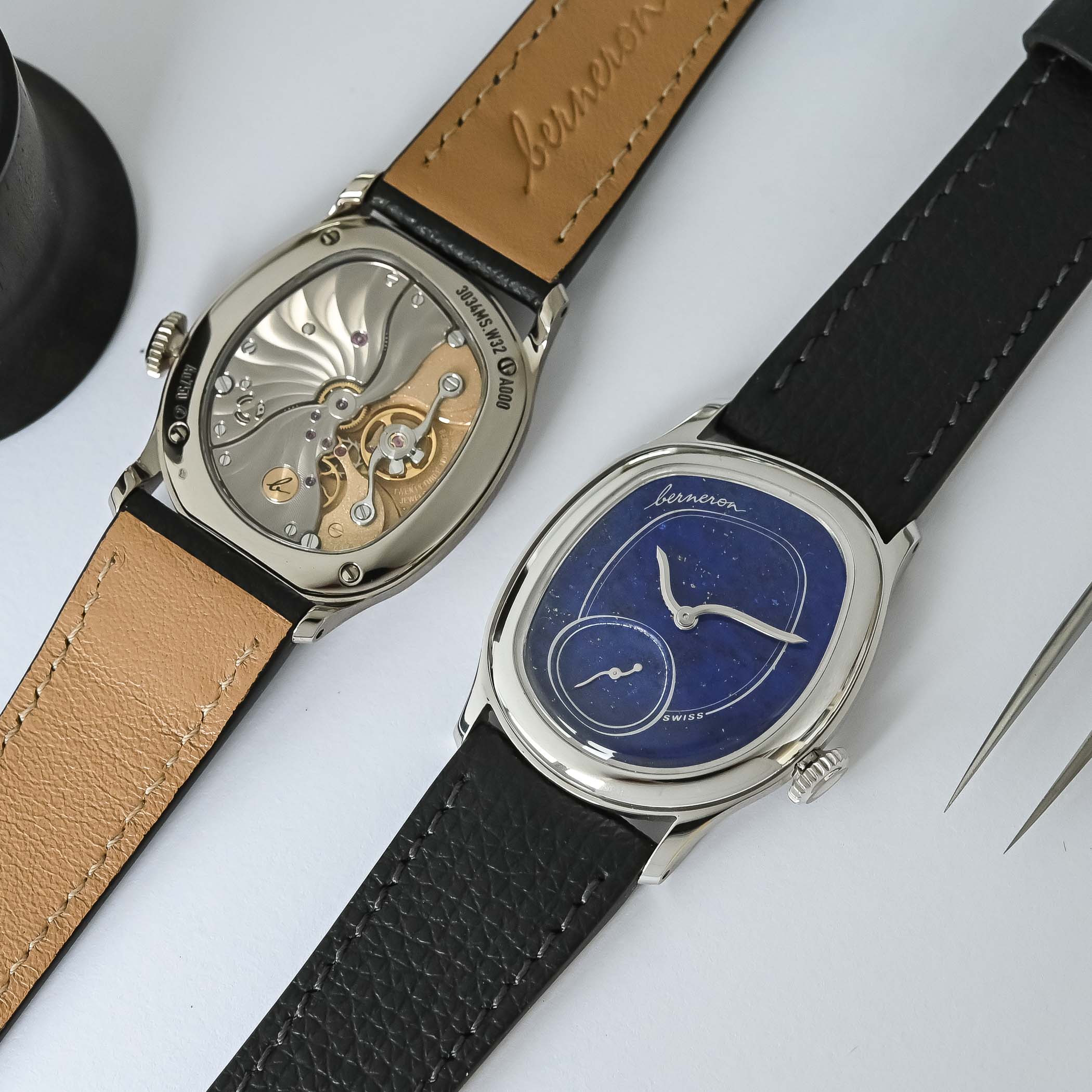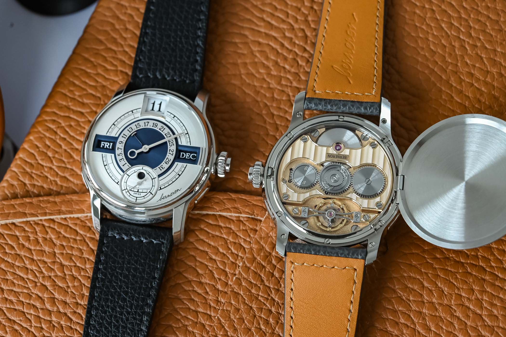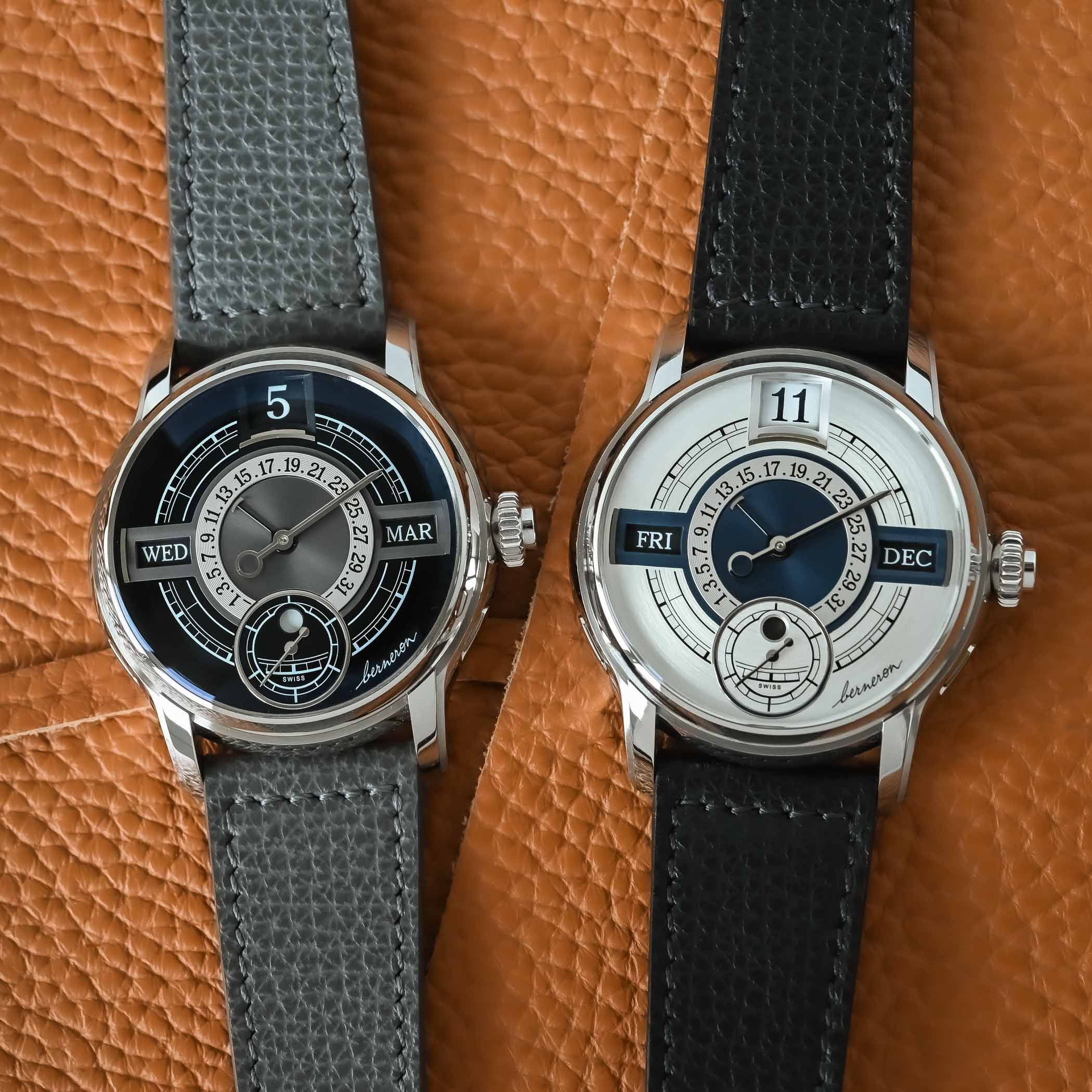 Two editions of the Berneron Quantième Annuel will be produced, one with a black dial and silver-grey accents, one with a silver dial and blue accents. The dial itself is made of solid gold, and it is paired with faceted gold hands.
