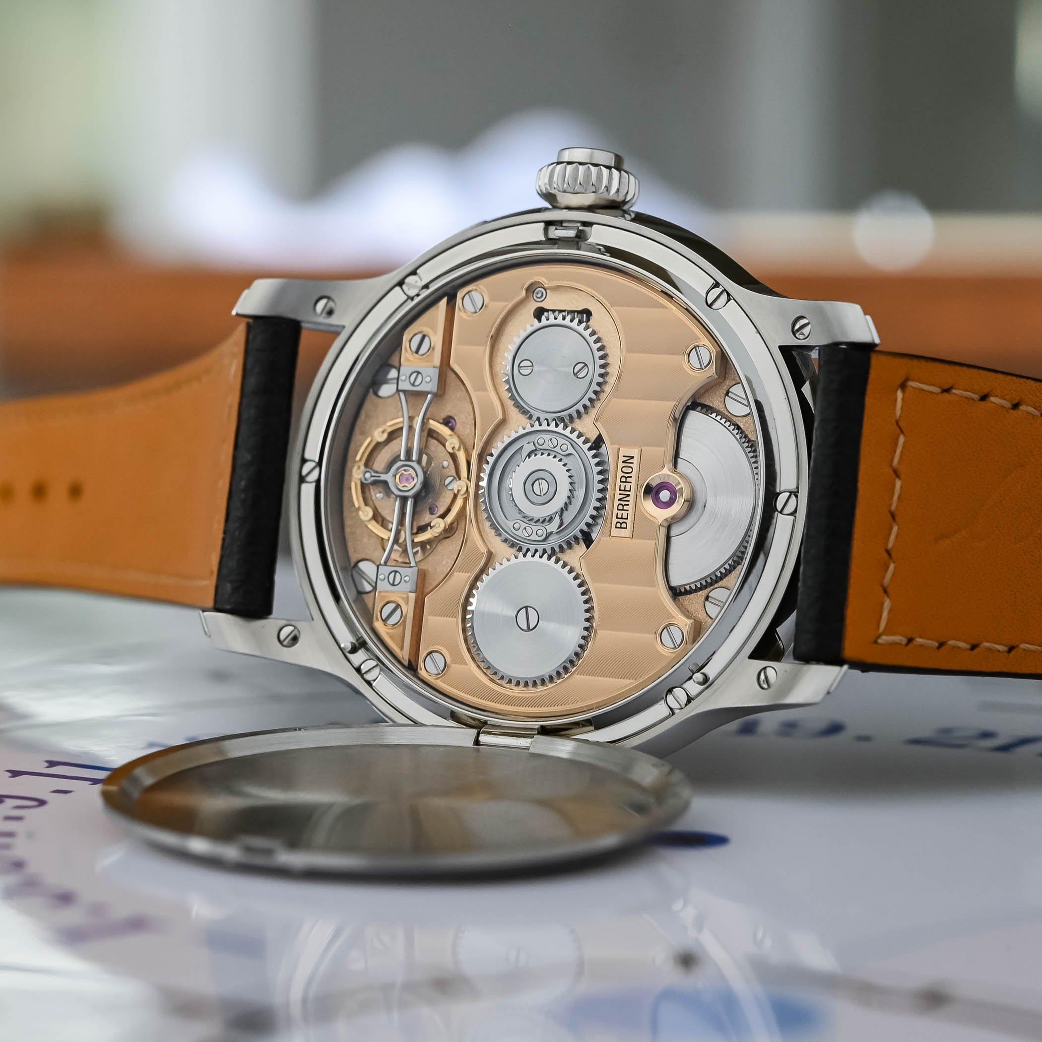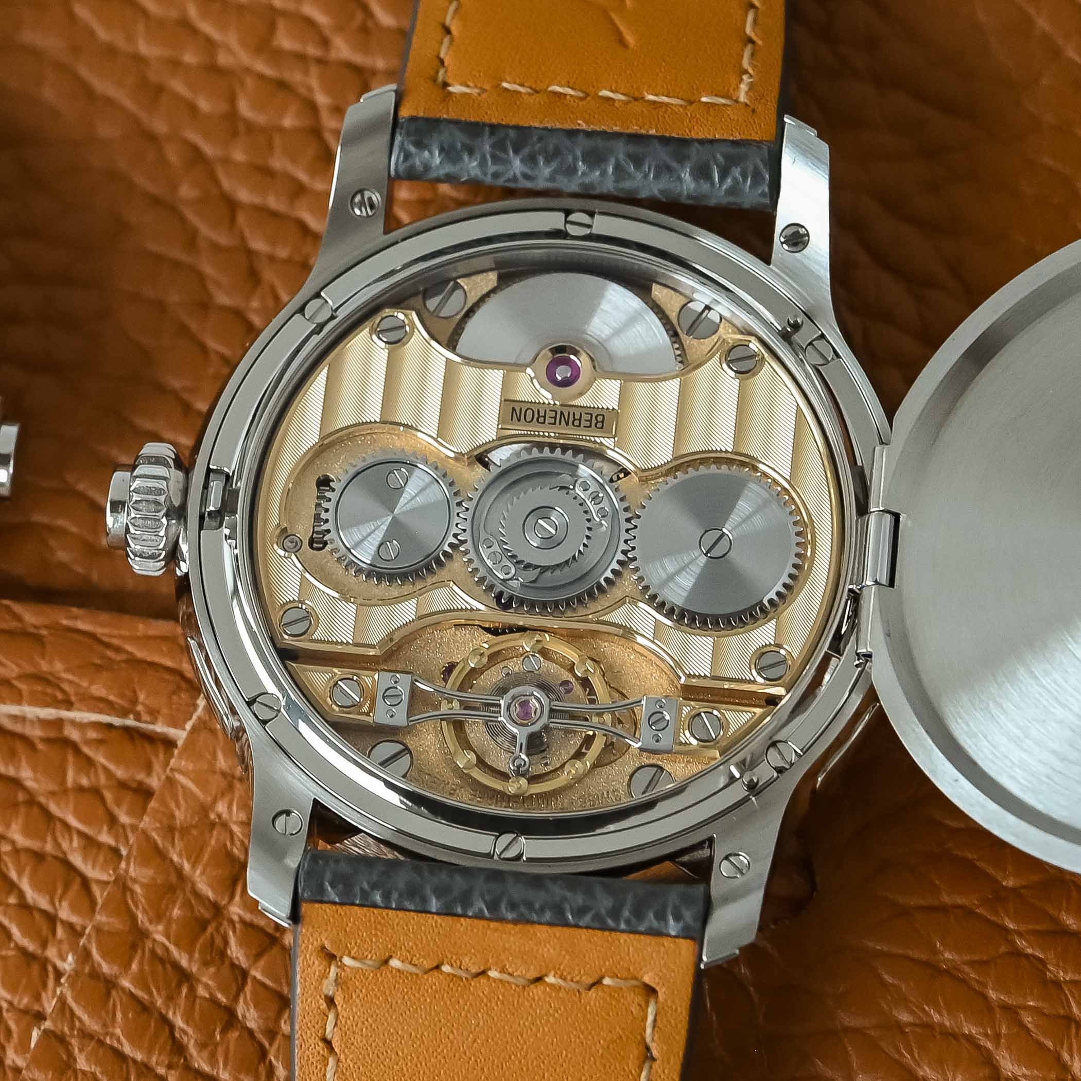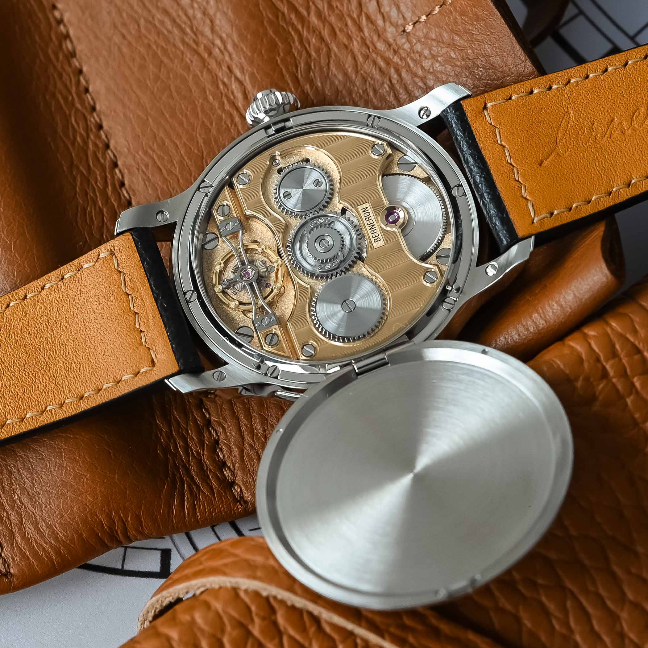 Under the hunter case back lies a new proprietary movement. Sylvain Berneron does not disclose the name of his manufacturing partner. While the movement of the Mirage was produced with Le Cercle des Horlogers, this new calibre is made with the support of a different company. Beyond the inevitable curiosity, it ultimately matters little: Berneron is transparent about the fact that the movement was neither fully developed nor manufactured in-house. What does matter is that it was created according to his exacting specifications and will progressively be assembled internally, ensuring full control over quality.