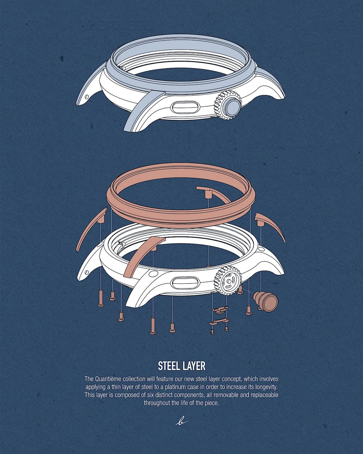 Beyond the apparent simplicity, it is, however, a sophisticated design comprising no fewer than 32 different elements. As mentioned in our introducing article, “One of the key features of the case is its construction, named Steel Layer. Most of the case, for 85% of its total weight, is made of 950 platinum. But to overcome the weaknesses of platinum, being easily scratched but tedious to repair, the case comes with a protective layer of 904L steel on the most sensitive parts to increase its longevity. This layer is composed of six distinct components (over the bezel, lugs and on the crown), all removable and replaceable throughout the life of the piece. The watch is also equipped with a classic crown and two pushers located at 4 and 8 o’clock, acting as correctors for the day and month jumping indications.”