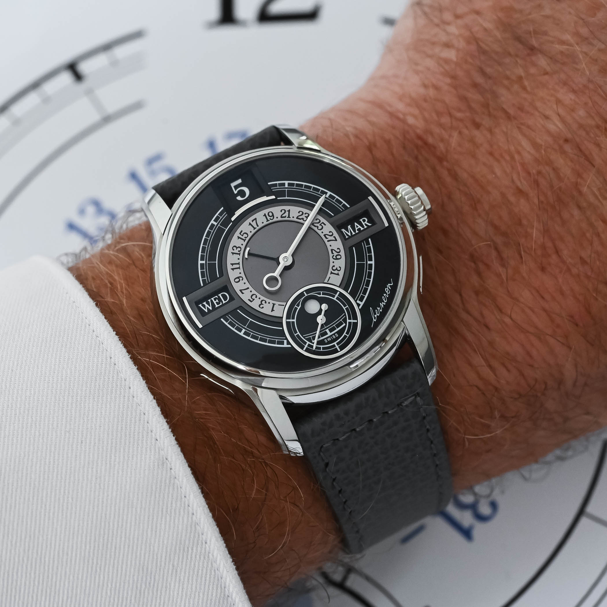 As mentioned above, following the exuberant Mirage, the Berneron Quantième annuel comes in a deceptively simple round case. On the wrist, it wears comfortably thanks to its compact dimensions (38mm x 10mm) and curved lugs. The watch profile is particularly elegant, accentuated by the subtle line of force running along its length to the lugs.