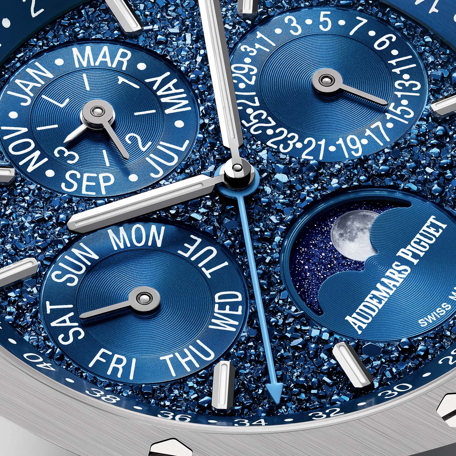 There are multiple reasons why we’ve selected this John Mayer x Audemars Piguet Royal Oak Perpetual Calendar in this list of the best calendar watches. The first is quite obvious when you look at the watch; it looks stunning, specifically with this modern take on the classic Tuscan dial perpetual calendar, with a “Crystal Sky” textured that feels like crystallised metal. The rest of the watch is classic RO QP, with a 41mm diameter white gold case and the display we’ve come to expect from this model, with its signature week display at the periphery of the dial. The main reason why we’ve listed this model here is more sentimental, as this watch will be the last of the series to be powered by the self-winding perpetual calendar calibre 5134, launched in 2015 and based on the calibre 2120 – launched in 1967 and at the heart of the Royal Oak Jumbo 5402ST of 1972 and all subsequent Jumbos. But with the launch of the 16202ST Jumbo with a new movement (calibre 7121), it would feel legitimate to replace the base of the perpetual calendar models, too. So here’s the swan song of the calibre 5134.