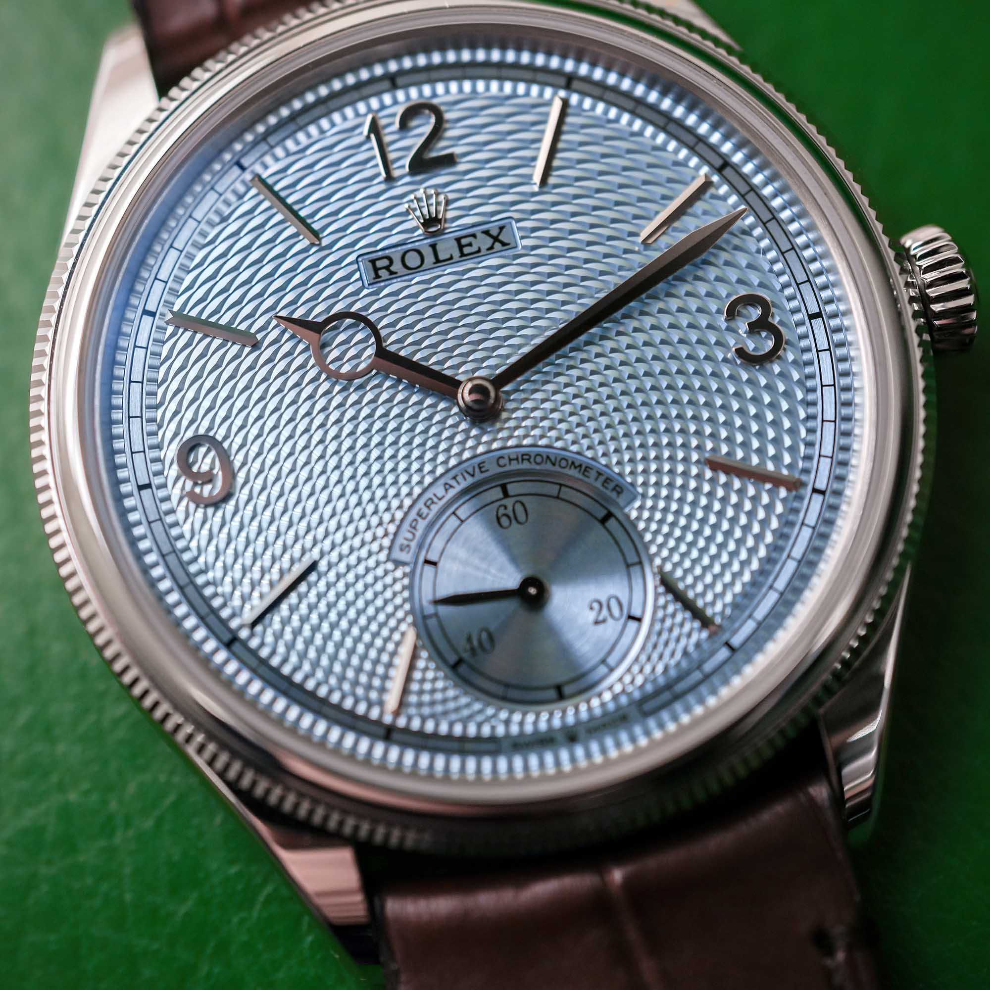Last but not least is the most surprising Rolex of the year. When it was unveiled last year, the Rolex Perpetual 1908 made quite a strong impression. While the inaugural models were appealing despite their minimalism, this new platinum version adds visual impact through a touch of traditional craftsmanship, a sector of the industry you don’t necessarily associate with Rolex. And still, the 1908 platinum comes with a light blue dial with a guilloché pattern – in reality, a rice-grain engine-turned pattern done on a hand-controlled machine, yet in a more modern way than, for instance, Breguet. Nevertheless, the result is polarizing, surprisingly traditional and extremely handsome. Inside, you’ll find the brand’s new automatic, thin calibre 7140 (visible under a sapphire back) and the platinum case retains its 39mm and finely fluted bezel. And at EUR 31,300, it’s not even crazy in terms of price.