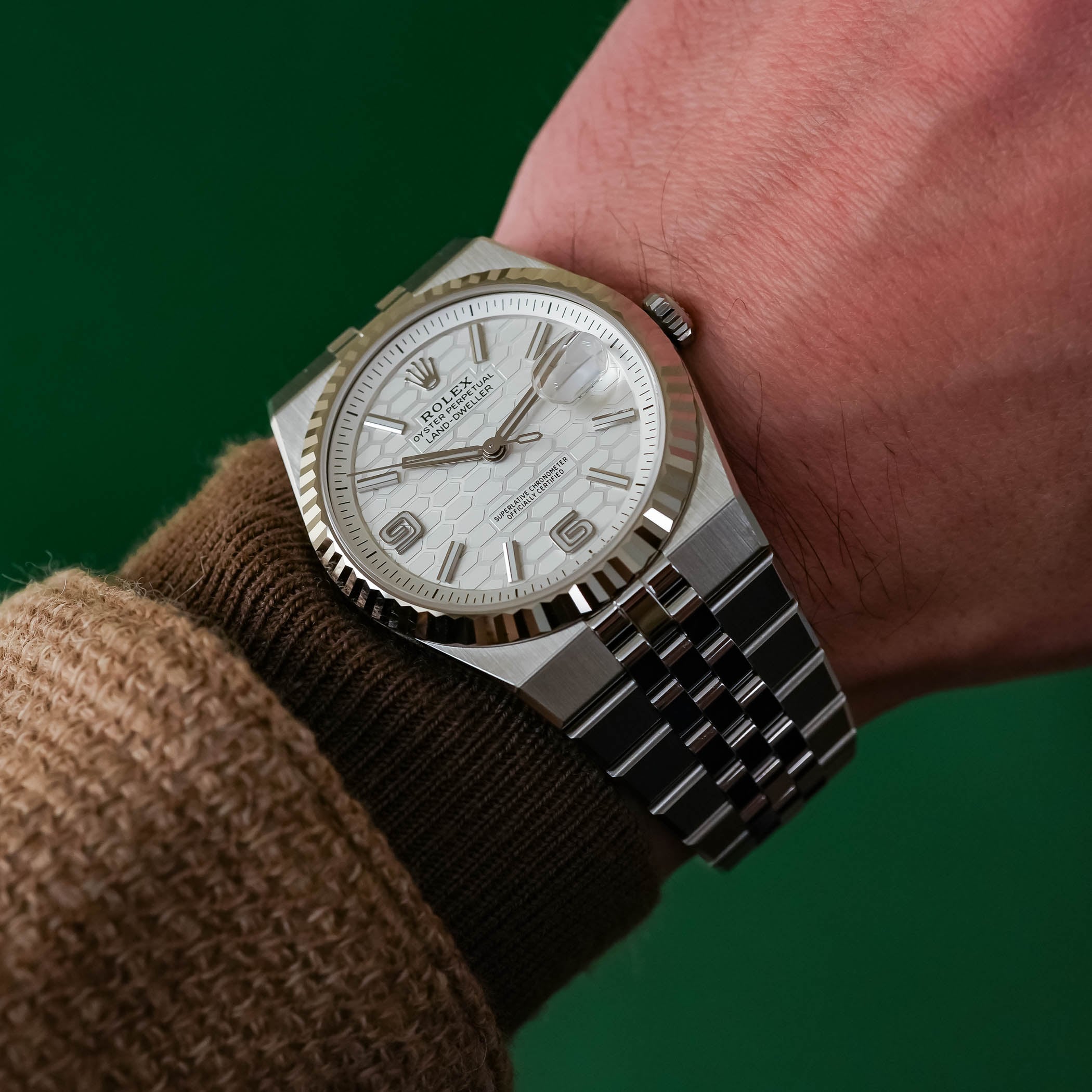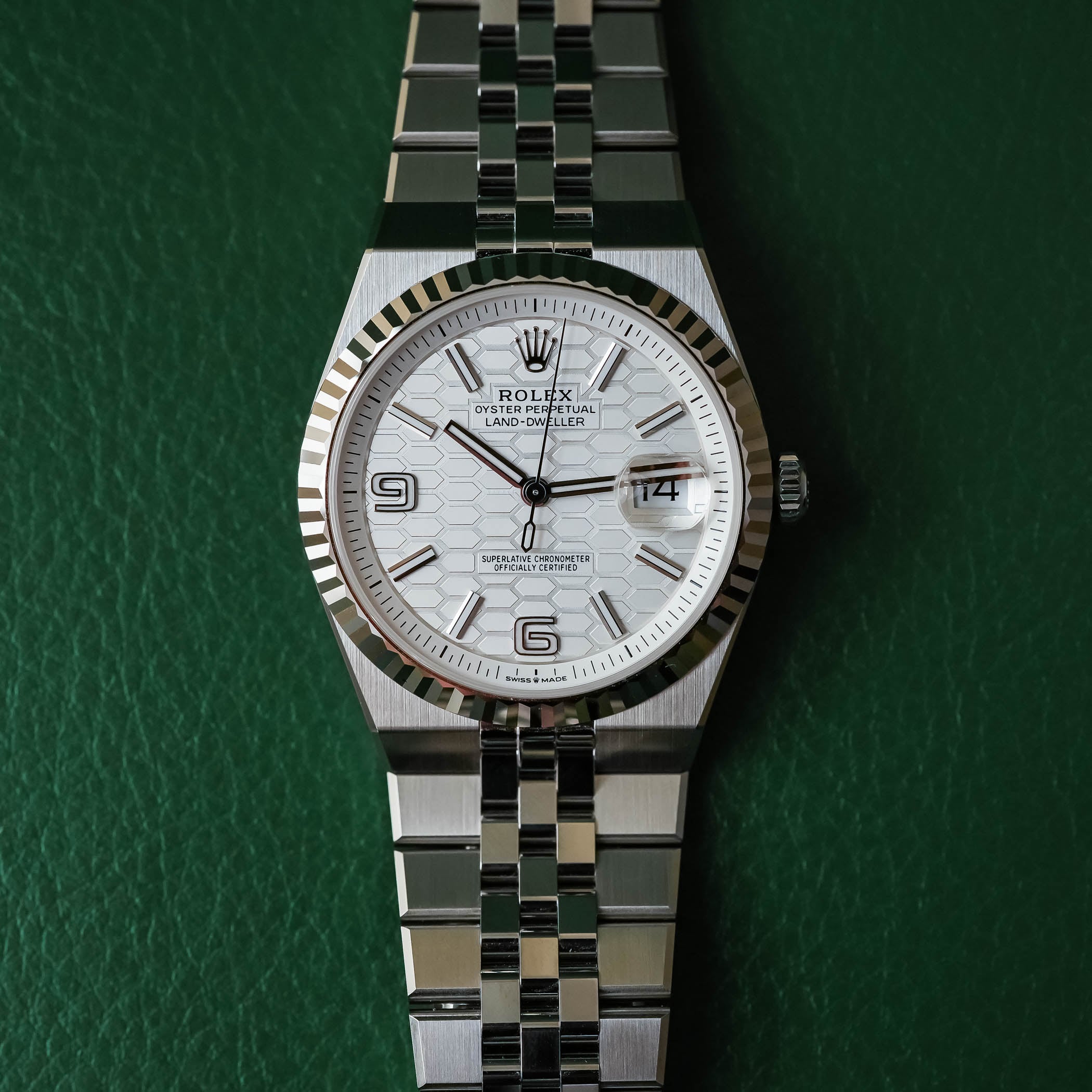 Rolex doesn’t often create entirely new collections, but 2025 brought the Land-Dweller, the brand’s return to the integrated sports watch. The 40mm steel version, with its white gold fluted bezel and new flat Jubilee bracelet, closes the gap between Datejust elegance and sportiness. The honeycomb-patterned dial, sapphire caseback, and innovative Dynapulse escapement of calibre 7135 mark a major technical leap.