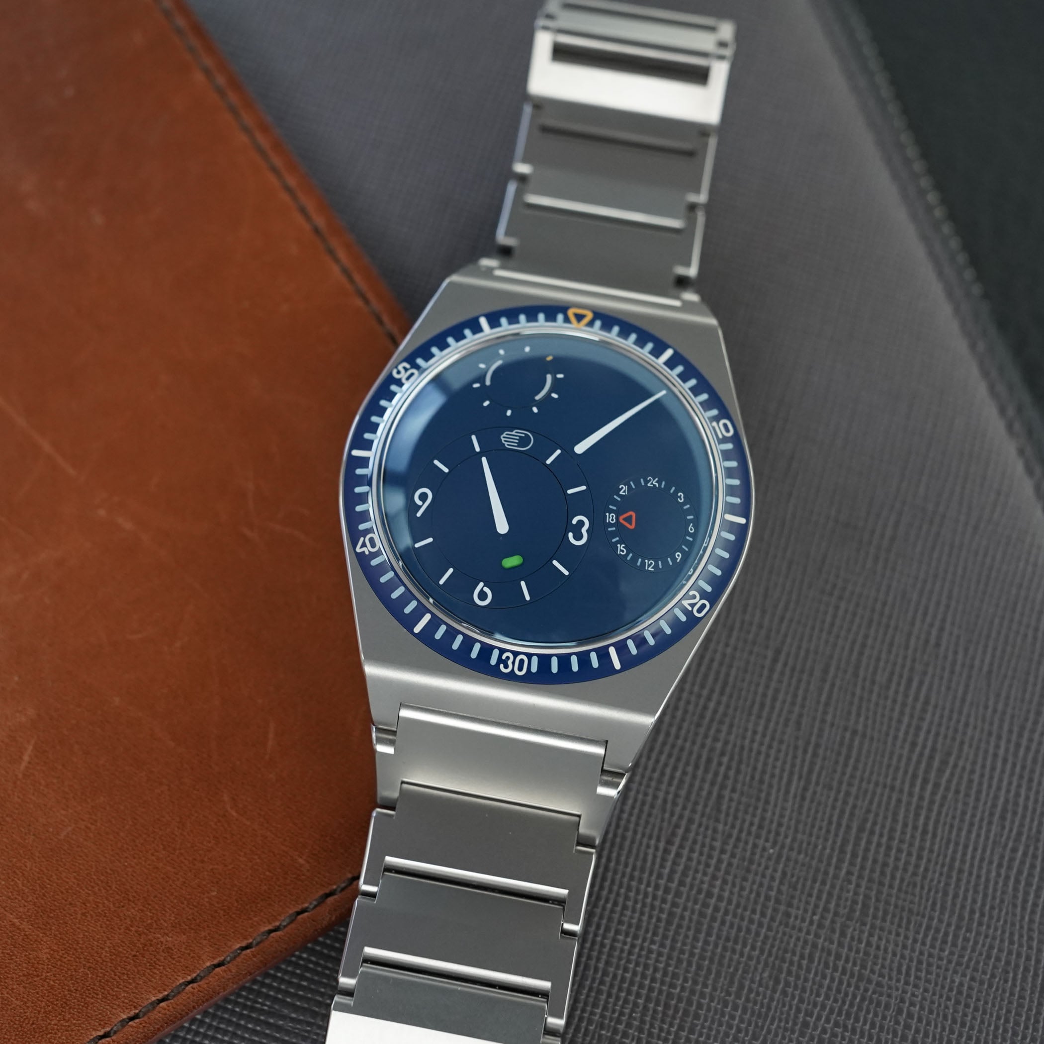 The Type 7 GMT introduced the brand’s oil-filled, distortion-free display to the travel watch market. Housed in a 41mm titanium case, the entire dial, composed of rotating discs, slowly orbits during the day, creating an ever-changing face of time. The unique back-set winding and setting system keeps the case crownless and sleek. While it’s not the most practical GMT on earth, it’s undoubtedly one of the most fascinating.