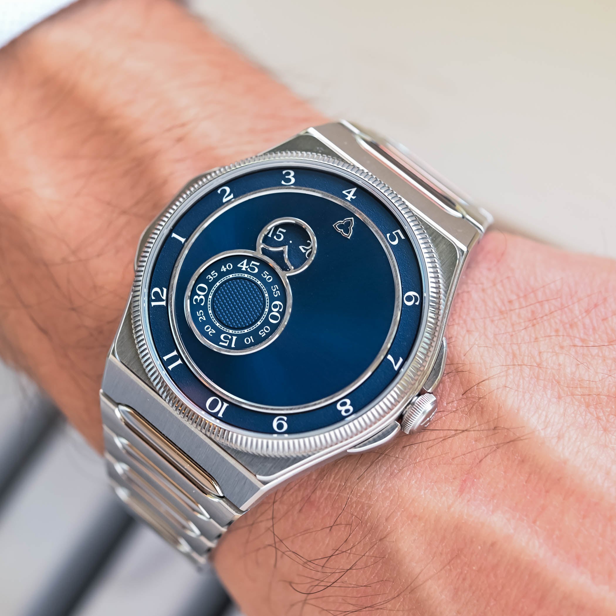 French independent Trilobe made an audacious debut in the integrated luxury sports arena with the Trente-Deux. The 39.5mm steel case and fluted bezel follow the codes of the category, but the poetic Trilobe display, three rotating discs for hours, minutes, and seconds, makes it stand apart. The brand’s first in-house calibre, the X-Nihilo, developed and built near Paris, is an added quality. The Trente-Deux combines avant-garde display, fine finishing, and Parisian savoir-faire in a truly distinctive package.